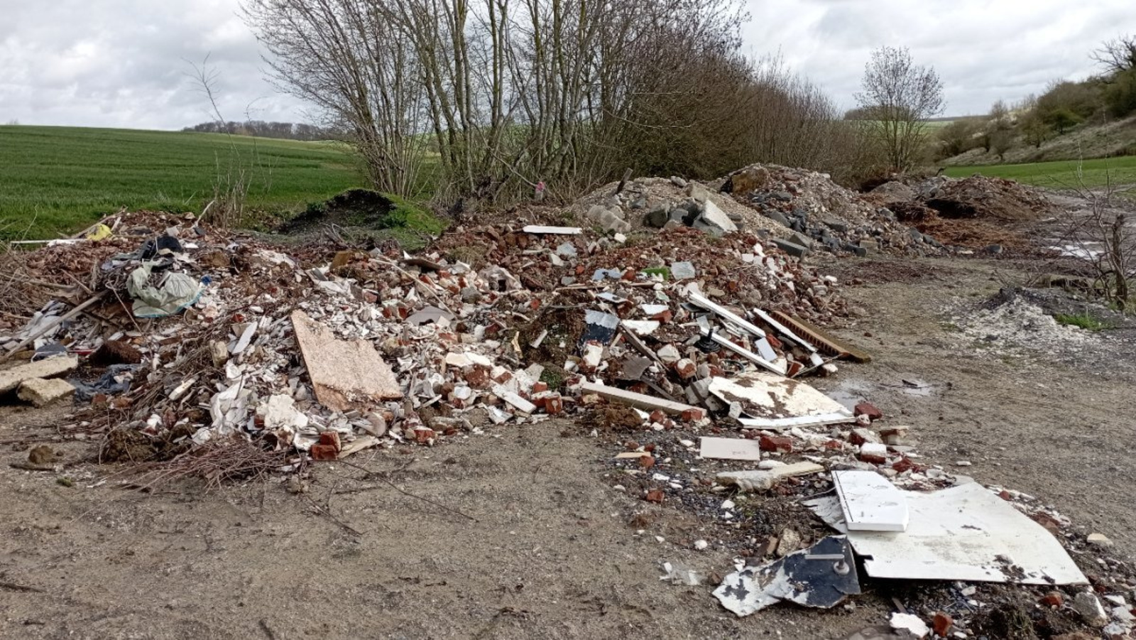 Décharge sauvage de déchets alimentée de déchets divers : gravats, végétaux, débarras de maison, plastiques en tout genres, plâtre, rouleaux de gaines électriques, bombes de peinture, carrelages, etc.