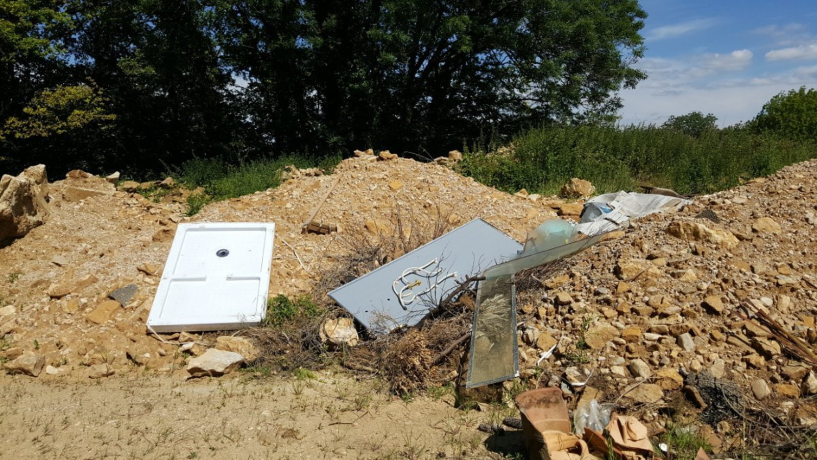 Cette décharge est présente en bordure du bois des Escomboles. Elle est composée de dépôts de chantier : dépôt de goudron, plots de démolition, tuyau amiante, gravats de toutes sortes.