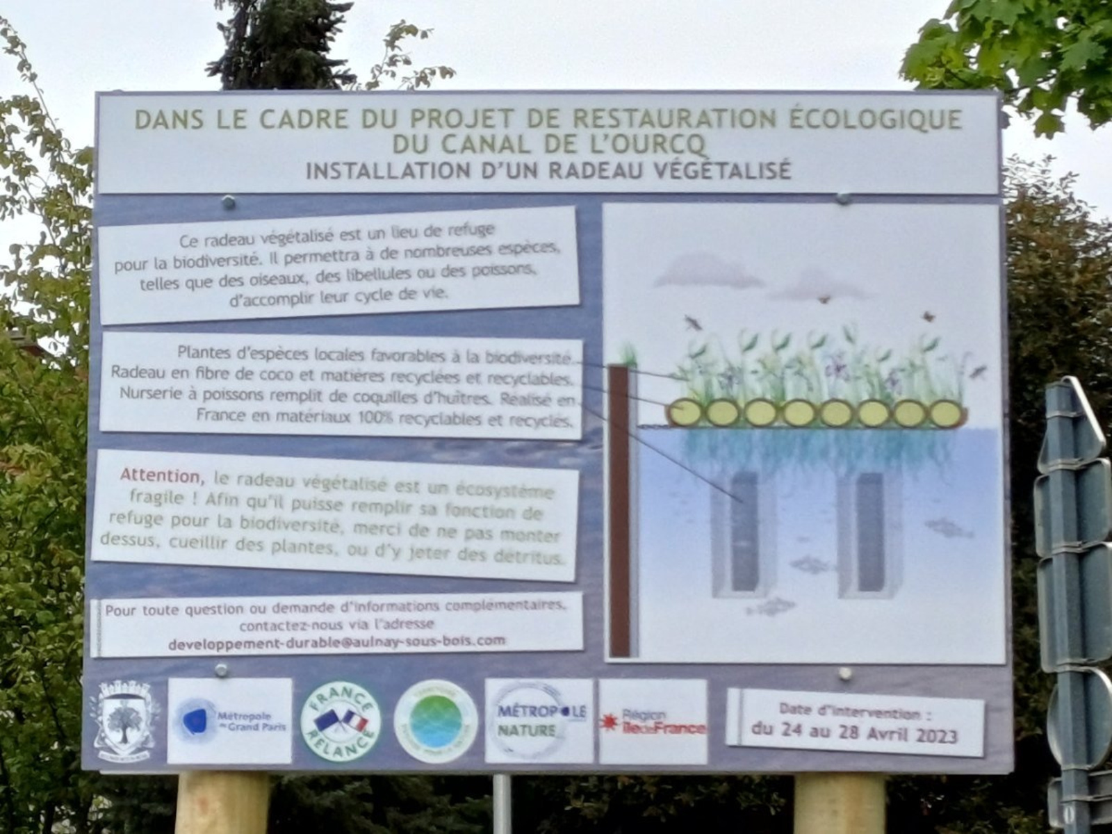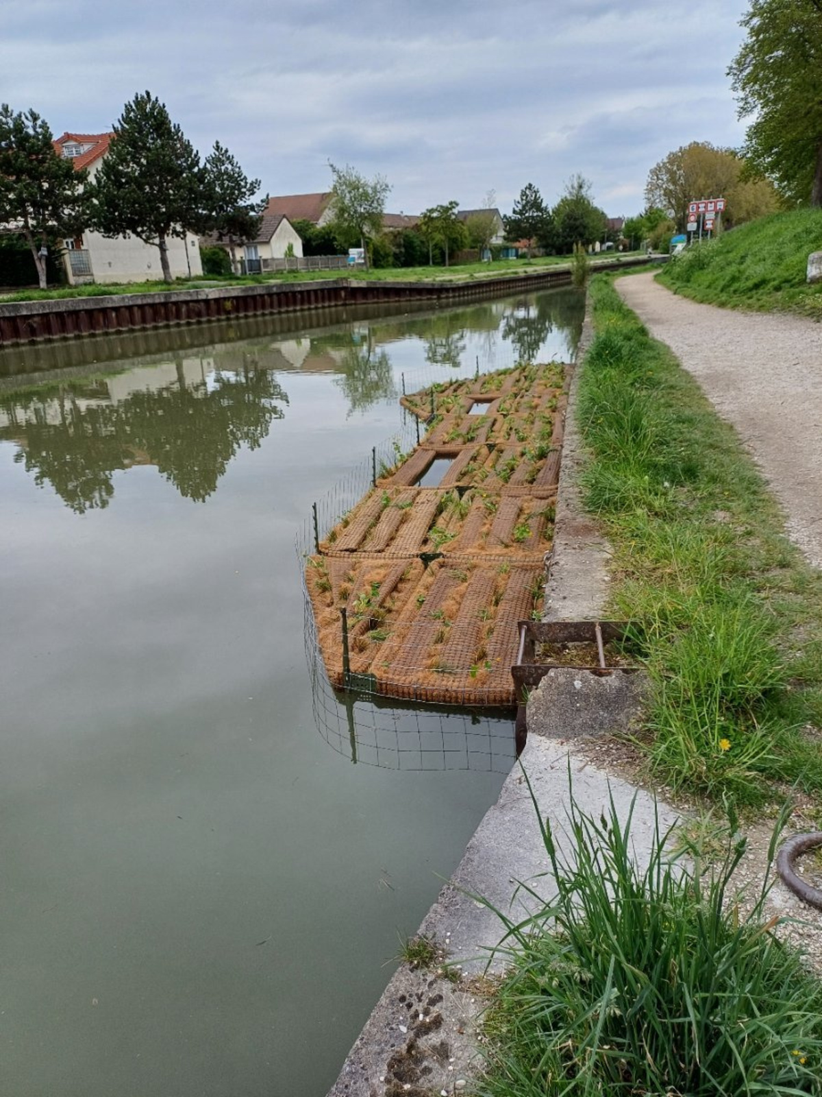 Dans le cadre du projet de renaturation des berges du Canal de l'Ourcq, un radeau végétalisé a été installé fin avril 2023. Situé en face de l'avenue Pierre Jouhet, cet aménagement permettra de créer un milieu écologique riche en biodiversité, à l'interface entre le milieu aquatique et les berges.