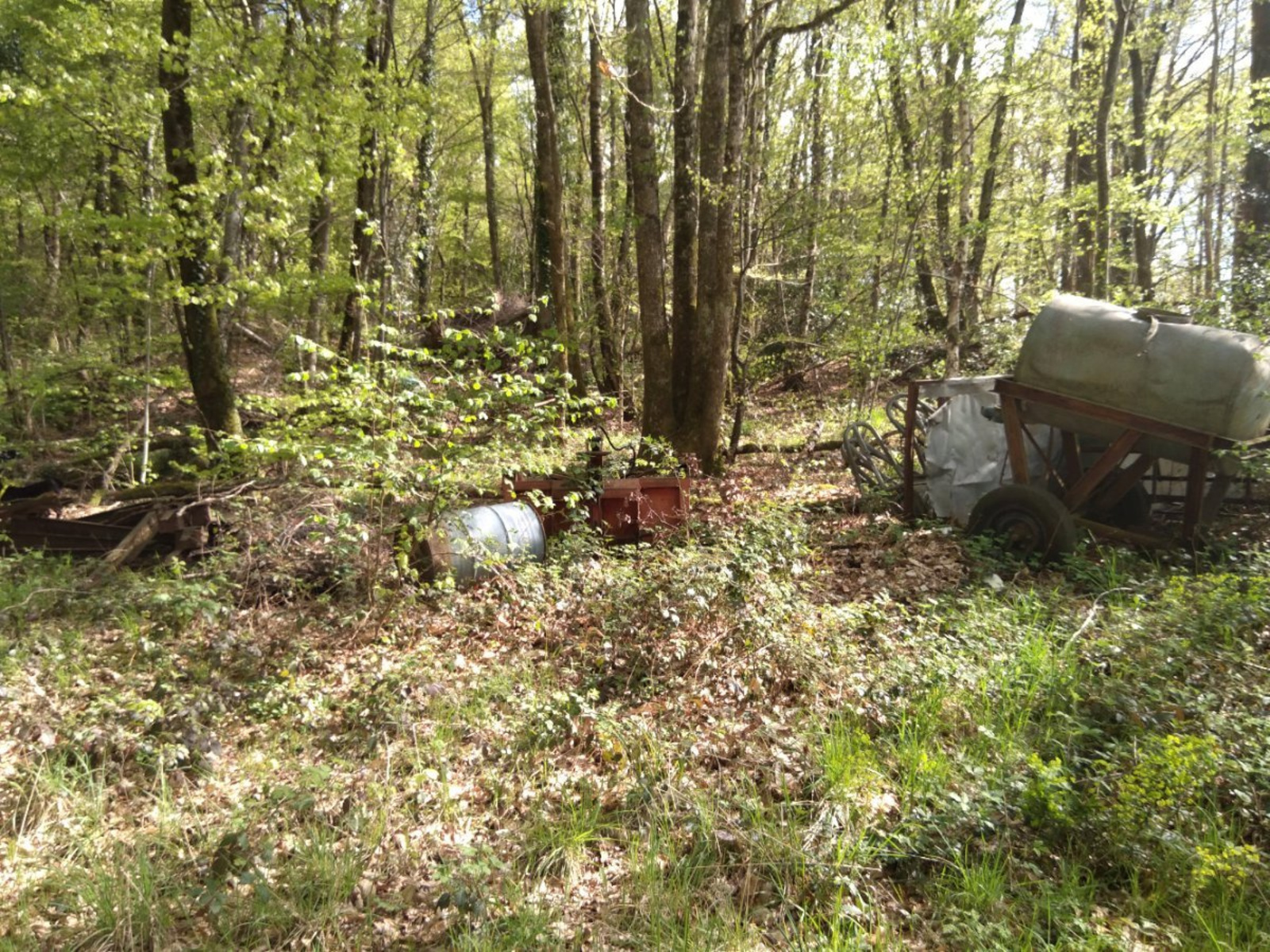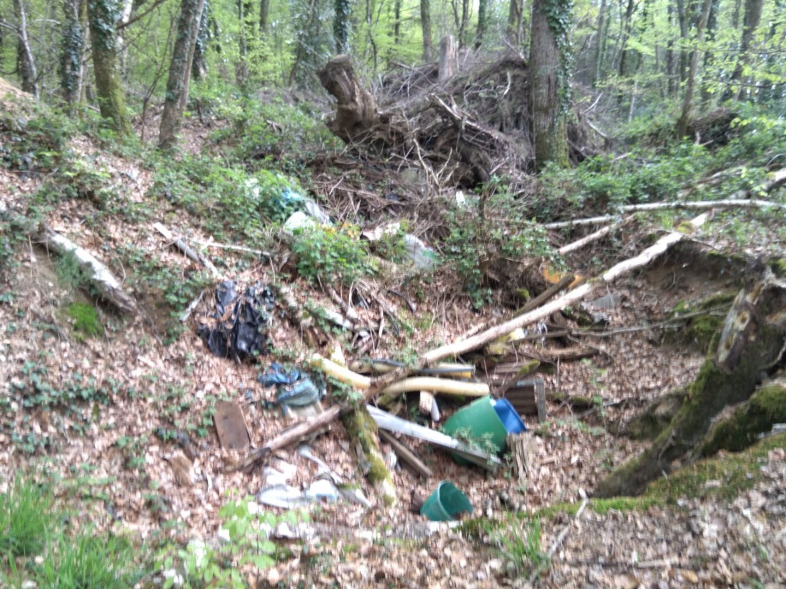 Des seaux et autres bidons pleins et vides sont jetés dans un trou dans les bois au ras du chemin communal. Sont également présents des bâches plastiques, des déchets verts et du matériel agricole usagé.