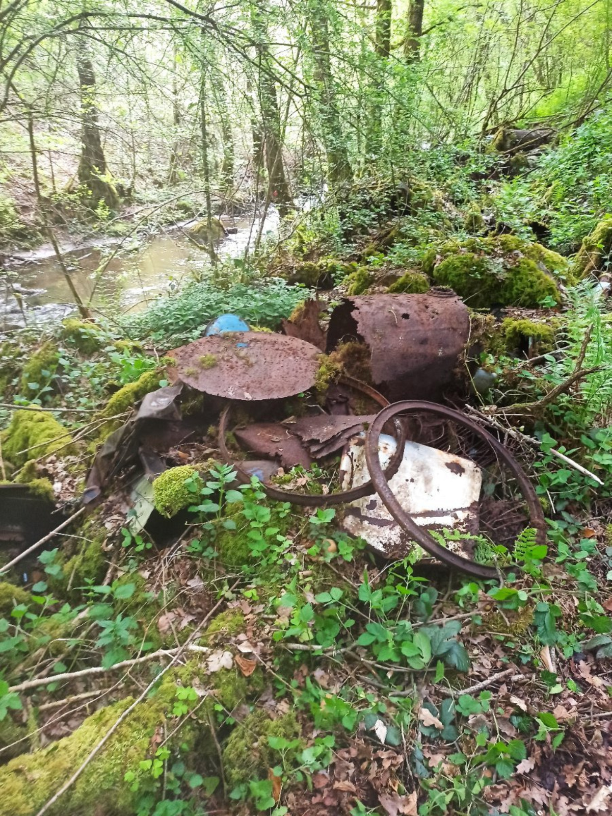 Sur une rive du cours d'eau, grosse quantité de déchets (ferraille lourde, déchets agricoles, bouteilles en verre). Probablement une ancienne décharge sauvage . Zone assez pentue, pas facile d'accès, cours d'eau en contrebas.