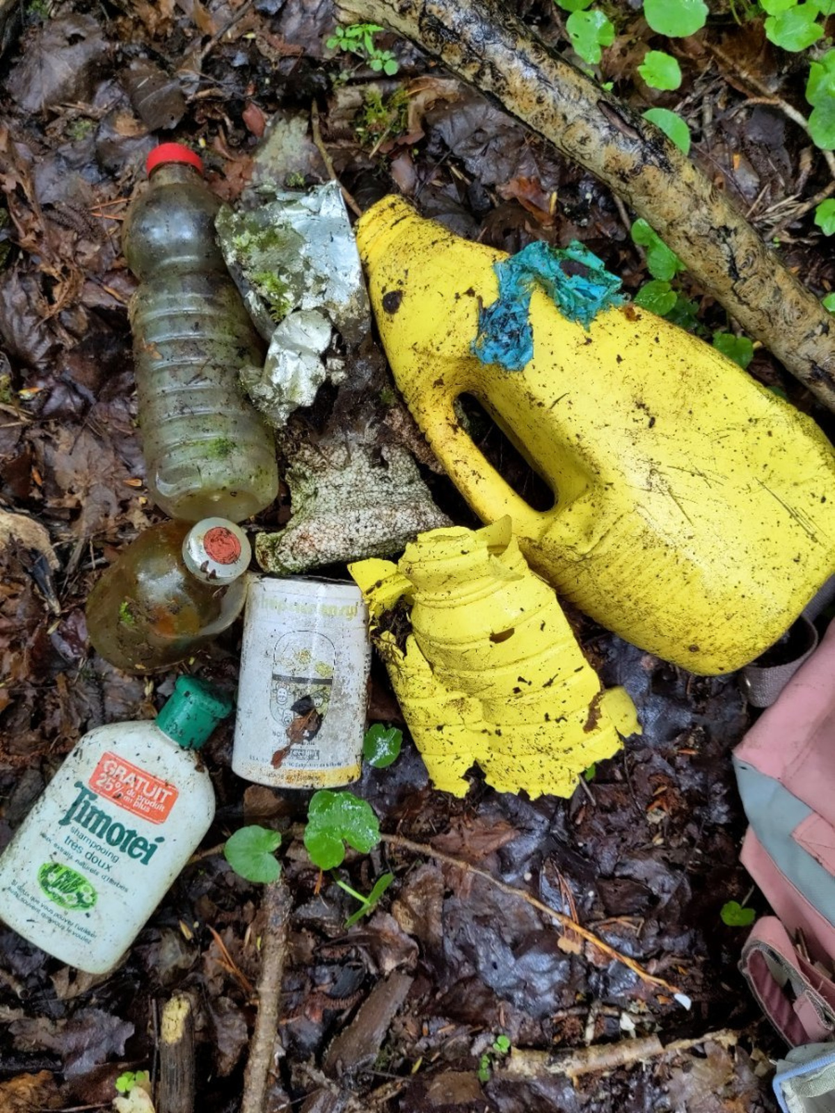 Divers déchets plastique ( contenants des bouts de polystyrène) et deux flacons d'antibiotiques pour bovins dans le ruisseau