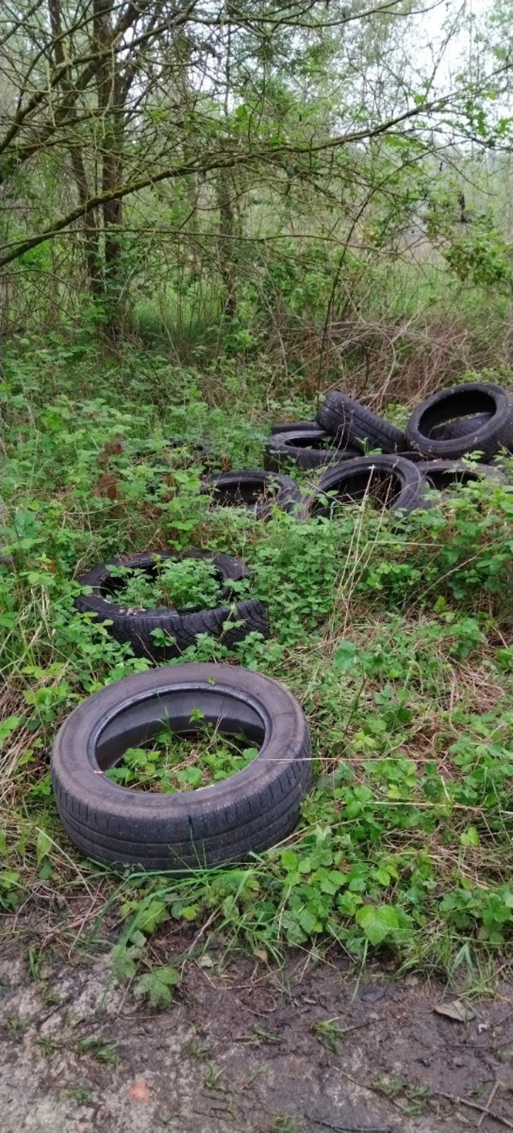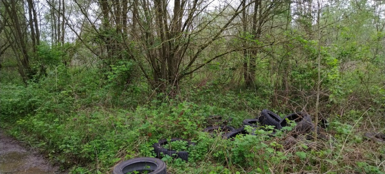 Plusieurs pneus abandonnés dans un chemin près de l'étang.