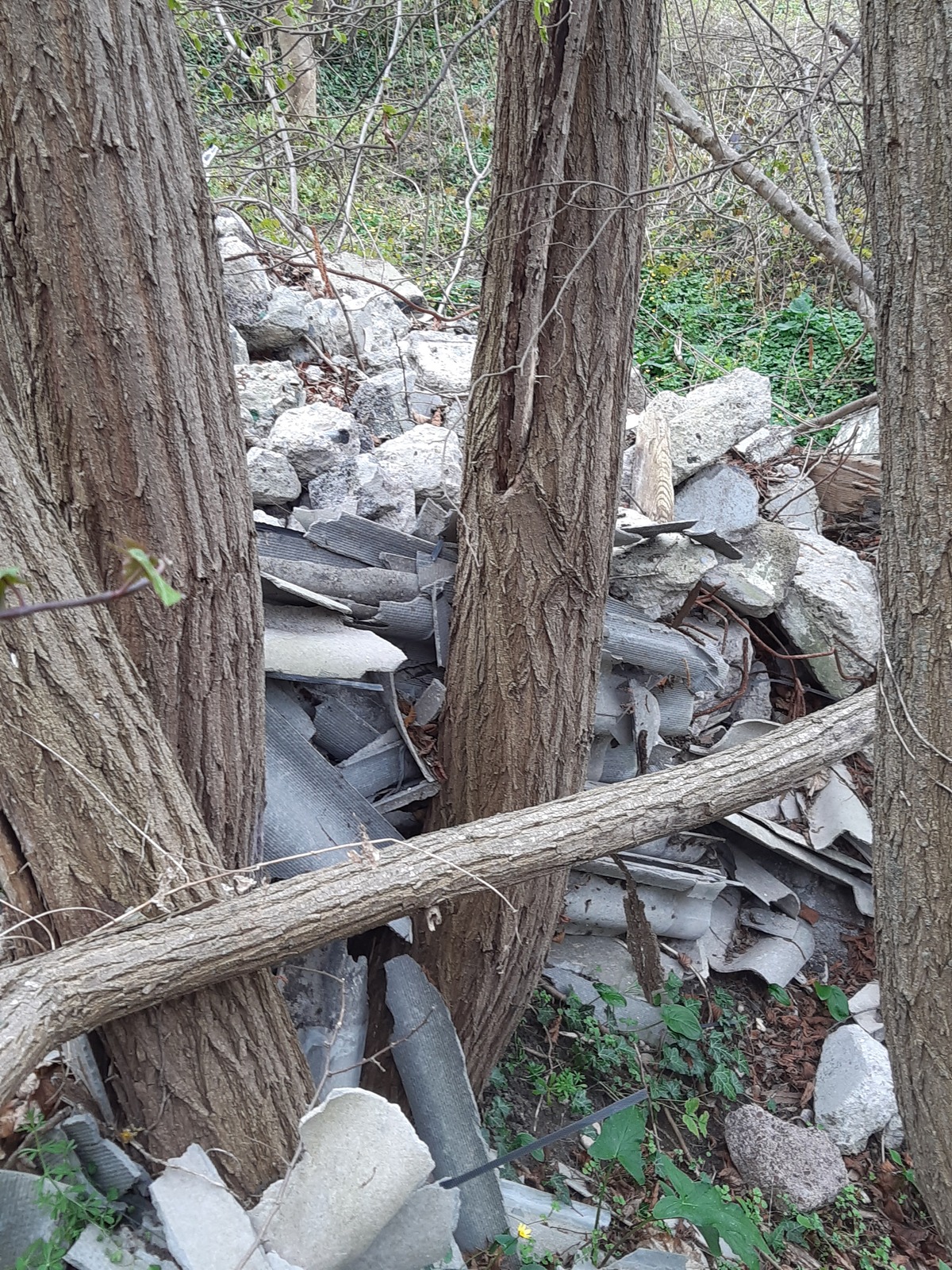 Nombreuses plaques de fibrociment jetés sur un chemin dans une zone boisée