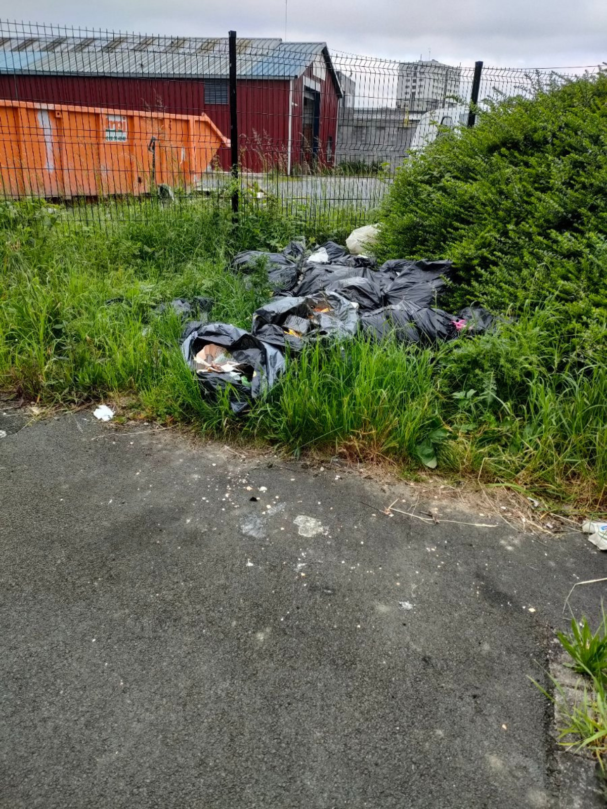 Dépôt sauvage constitué de plusieurs sacs poubelles remplis de déchets ménagers.