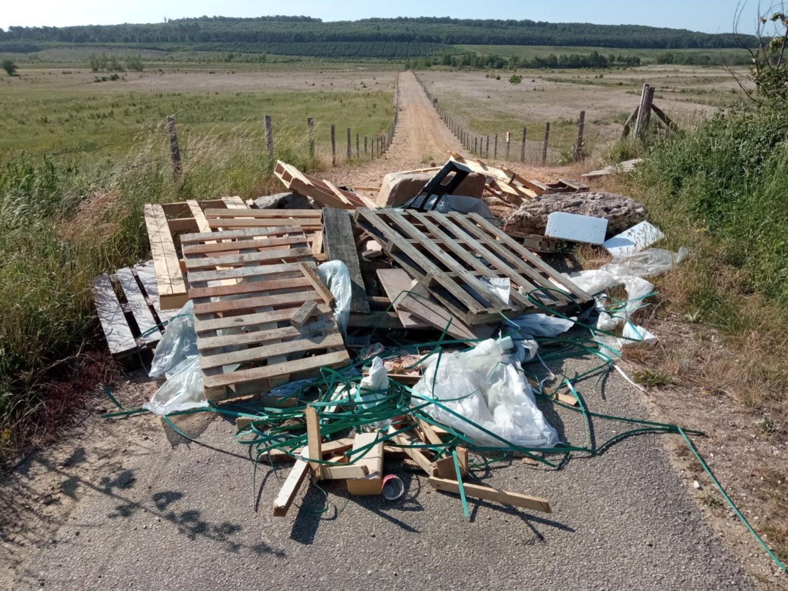 Amoncellement de palettes en bois en plein milieu d'un chemin