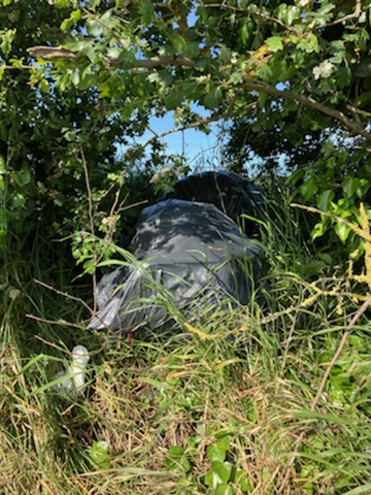 Dépôt sauvage de déchets constitué de plusieurs sacs poubelles abandonnés.