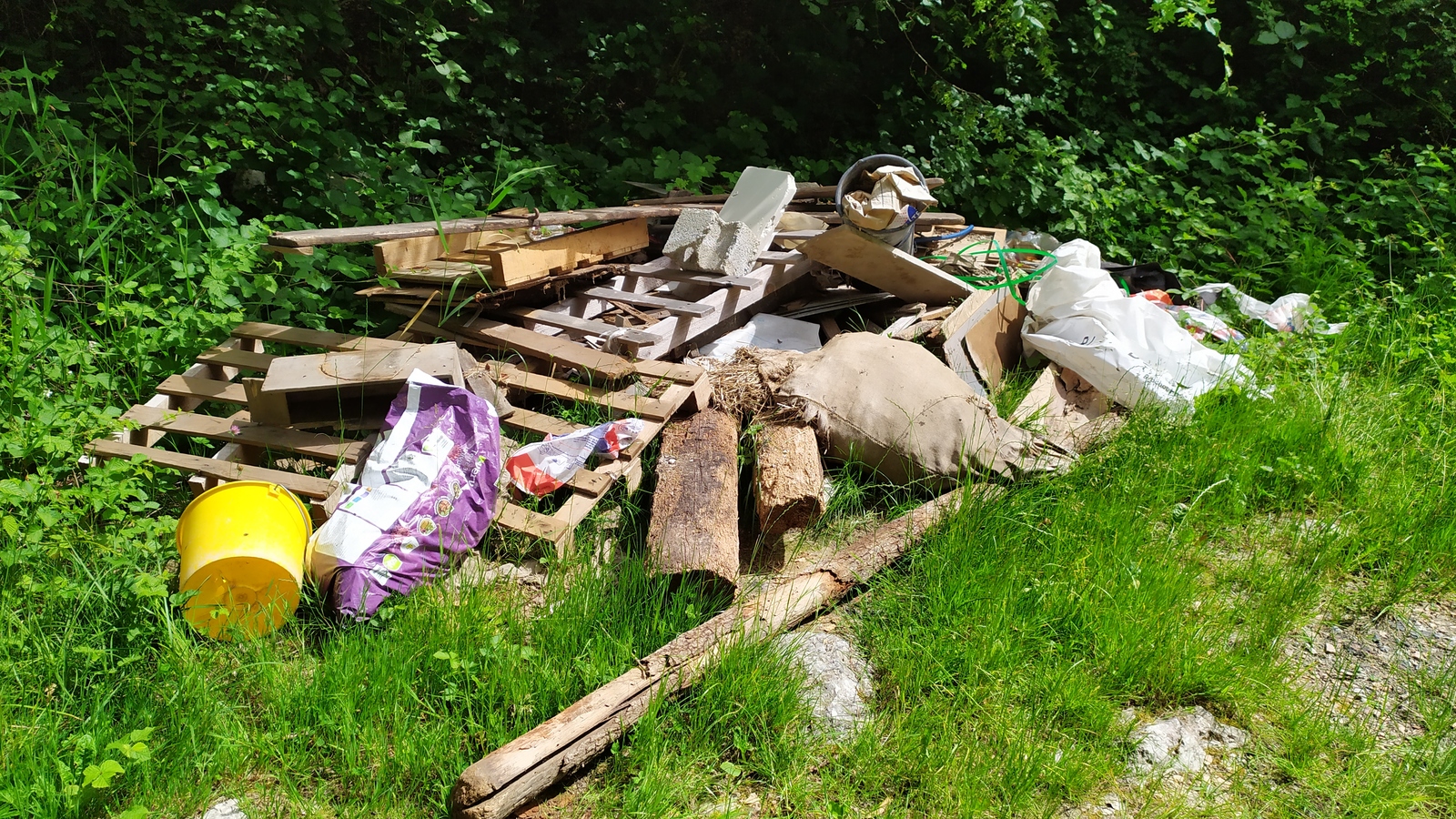 Dépôt de déchets divers (palettes, bois, plastiques) sur un chemin en forêt.