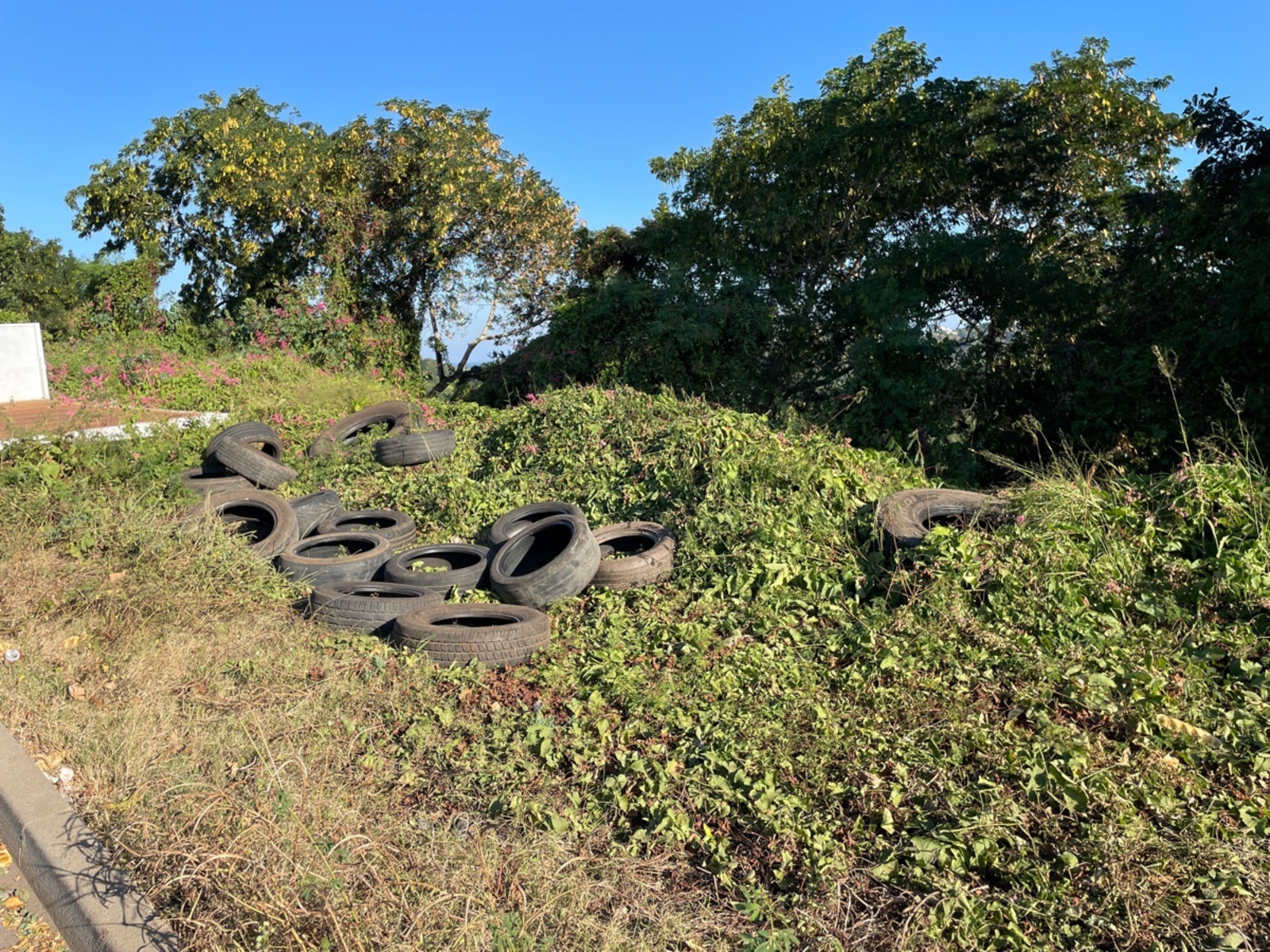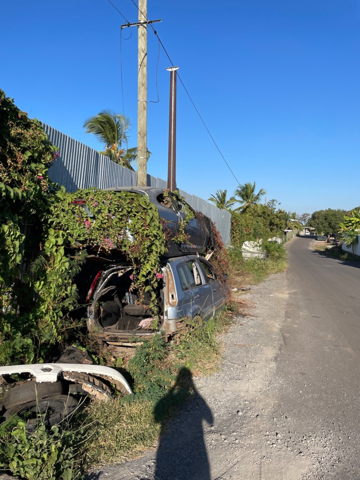 Le long de la route de la plage d'Hamaha ont été constatés des dépôts de déchets industriels, notamment des carcasses de véhicules (voitures, engins de chantier...) et des pneus usés.