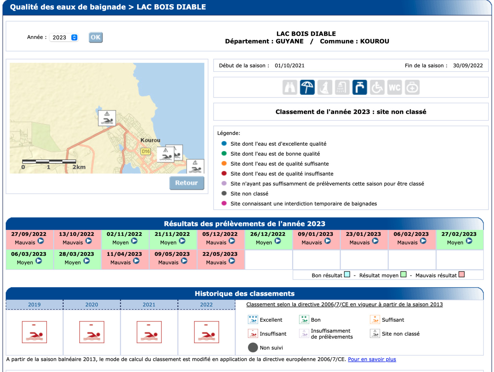 Le lac Bois Diable à Kourou présente une pollution microbiologique quasi-permanente depuis septembre 2022 selon les relevés de l'Agence Régionale de la Santé.