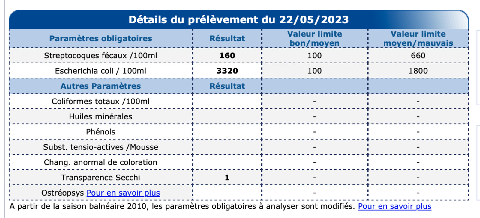 - Streptocoques fécaux /100ml (témoin de contamination fécale ancienne) : 160, soit un dépassement de 60% de la valeur limite d'une eau de baignade de bonne qualité.