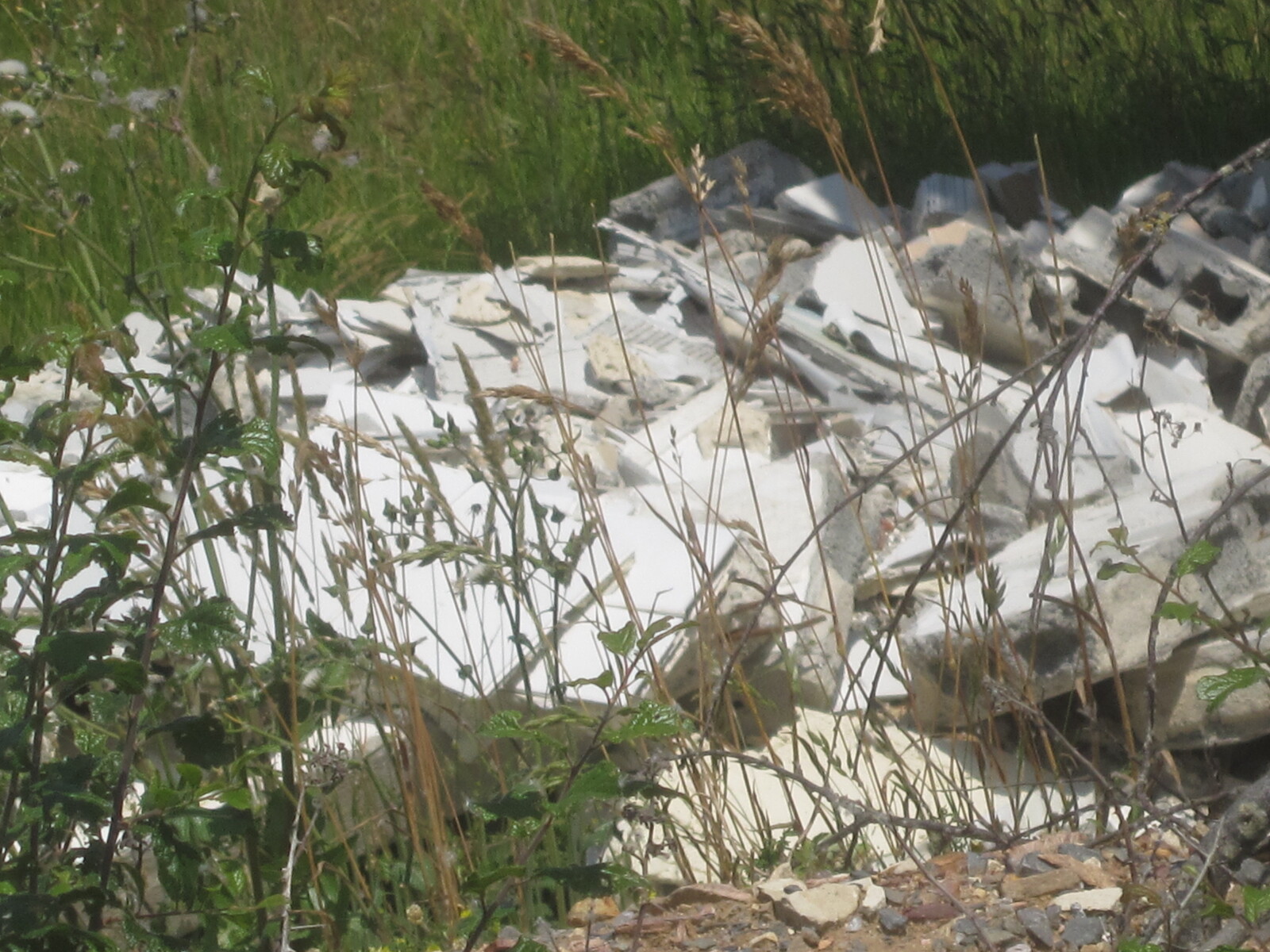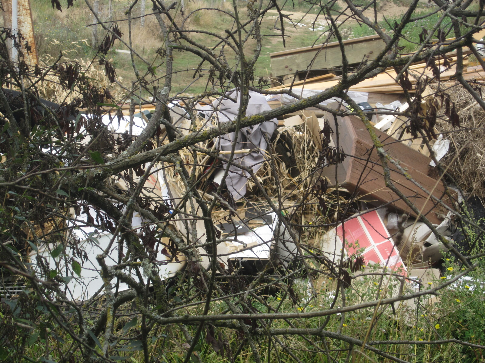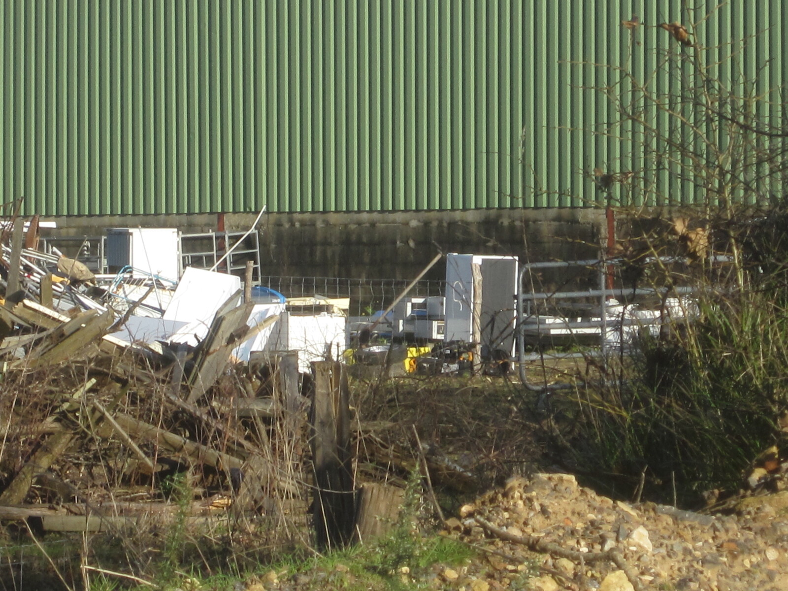 Dépôt de déchets divers (déchets du BTP, déchet verts, plastiques, carcasses de voitures et appareils électroménagers) dans et à l'arrière d'un ancien corps de ferme.