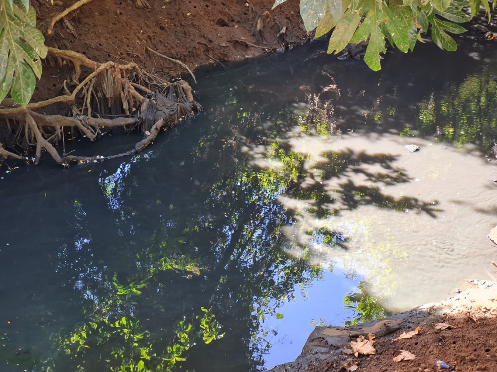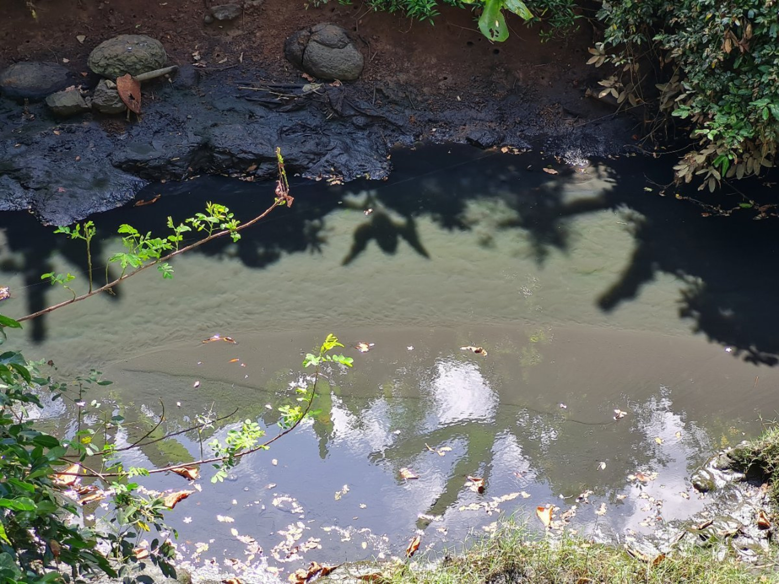 La rivière de Bouyouni est polluée, probablement par des charbons actifs utilisés en amont au captage d'eau. L'eau et les berges du cours d'eau sont de couleur grise.