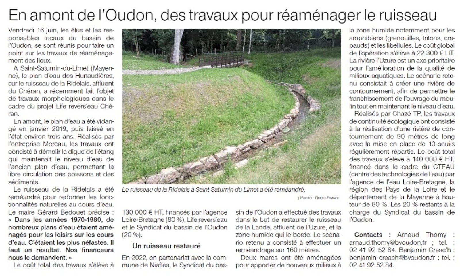 En 2022, le Syndicat du bassin de l'Oudon a effectué des travaux dans le but de restaurer le ruisseau de la Ridelais et la zone humide qui le borde. Cela a consisté à effectuer un reméandrage sur 160 mètres. Le but était de restaurer la continuité écologique, une zone humide avec différents habitats et de redonner les fonctionnalités naturelles au cours d'eau.