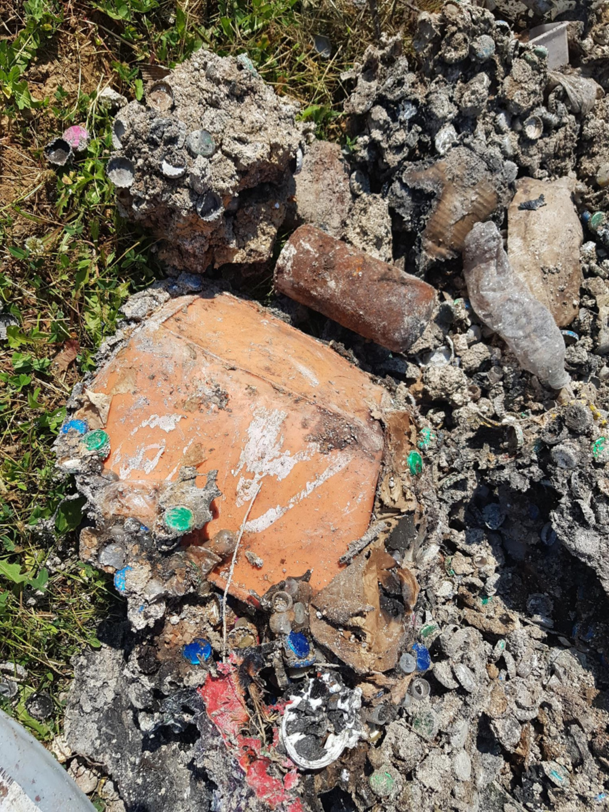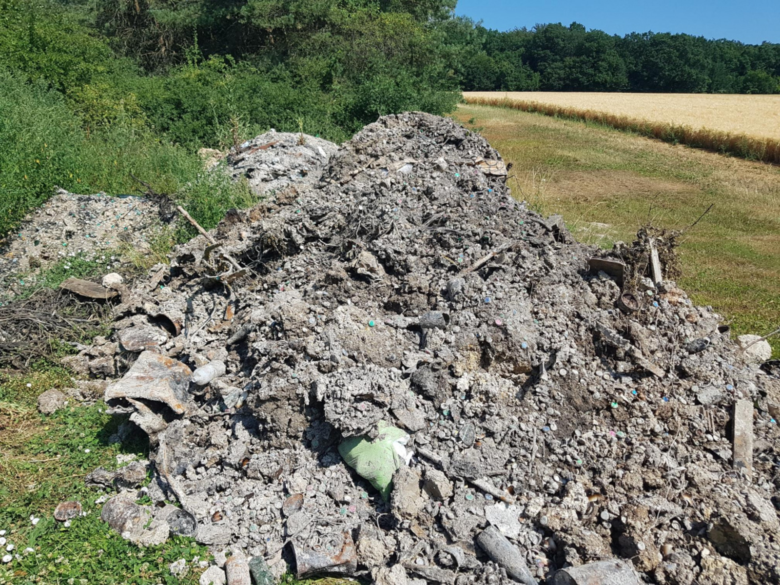 Un amoncellement de déchets d'activités économiques brûlés, dont certains sont dangereux, est visible depuis plusieurs mois sur une bande enherbée d'une parcelle agricole, à la lisière du bois. Y ont été observés, par exemple, des bidons de pesticides, des filtres à huile et des capsules de bouteilles de champagne.