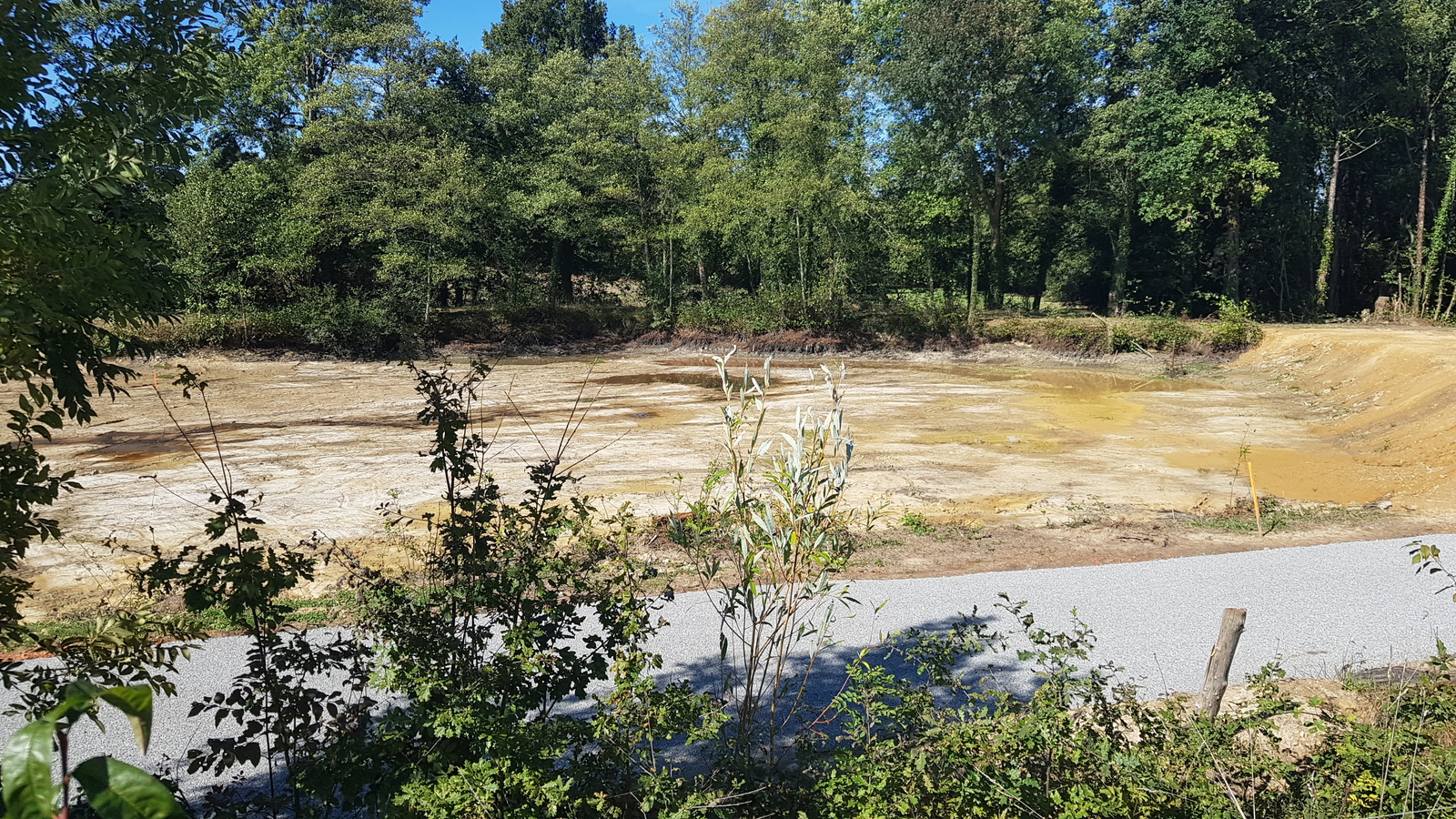 Comblement d'un plan d'eau avec des gravats de construction divers. Réaménagement du reste de la parcelle (arbres coupés, décaissement important) laissant supposer un changement de destination.