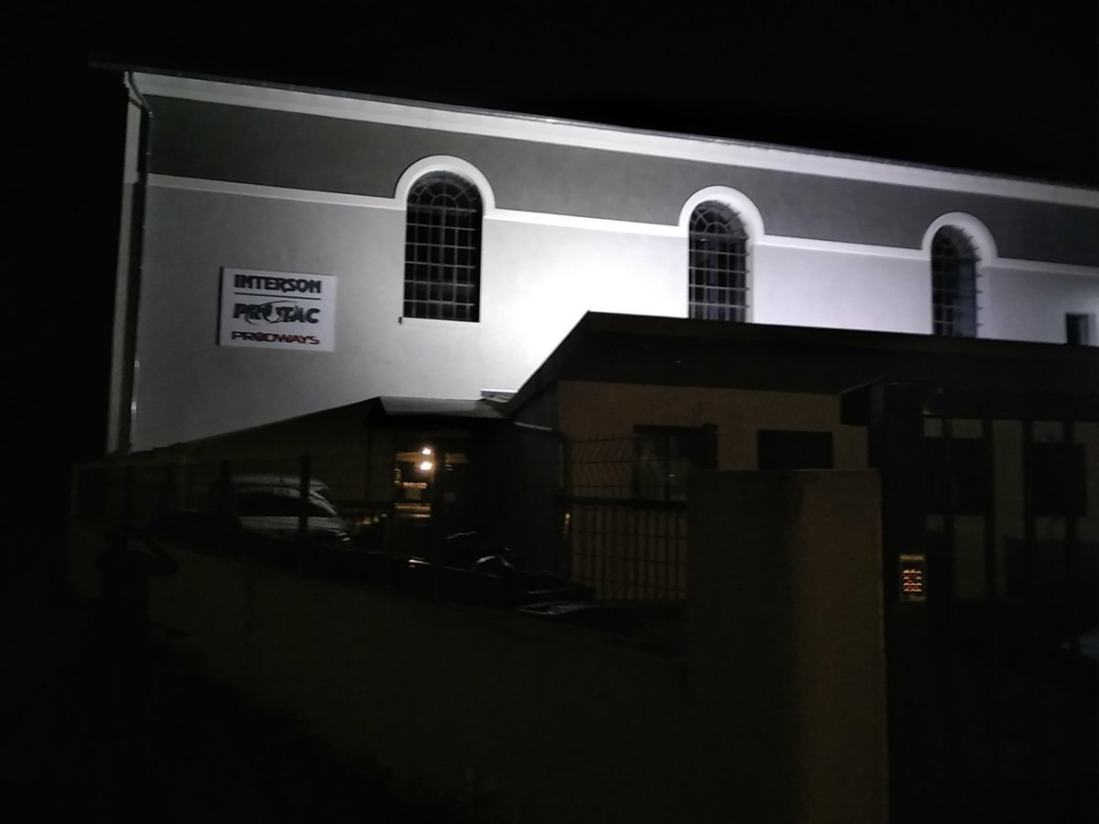 Façade et parking encore éclairés à 4h25.