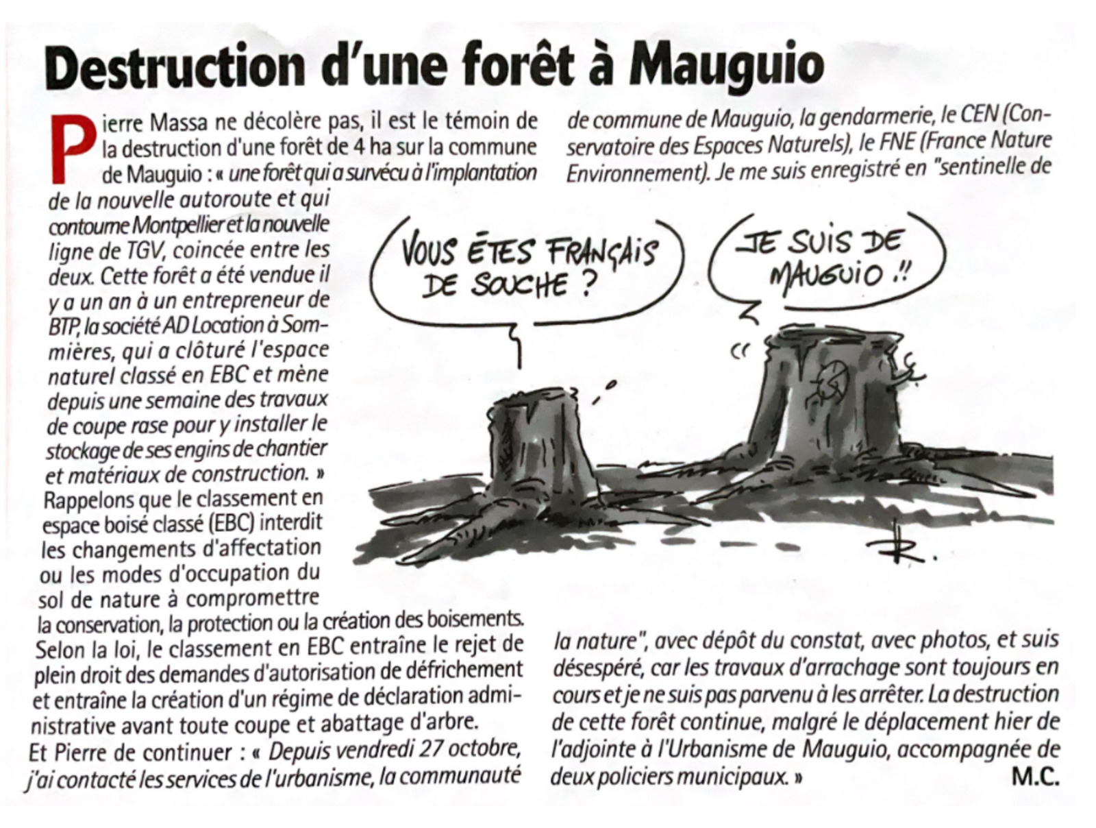 Destruction d'une forêt de 3ha, répertoriér au PLU de la commune de Mauguio-Carnon comme espace boisé classé (EBC). Le règlement du PLU rappelle que les coupes et abattages d'arbres au sein d'un EBC sont soumis à déclaration préalable, et que les défrichements (entrainant un changement de destination du sol) sont systématiquement rejetés dans les EBC.