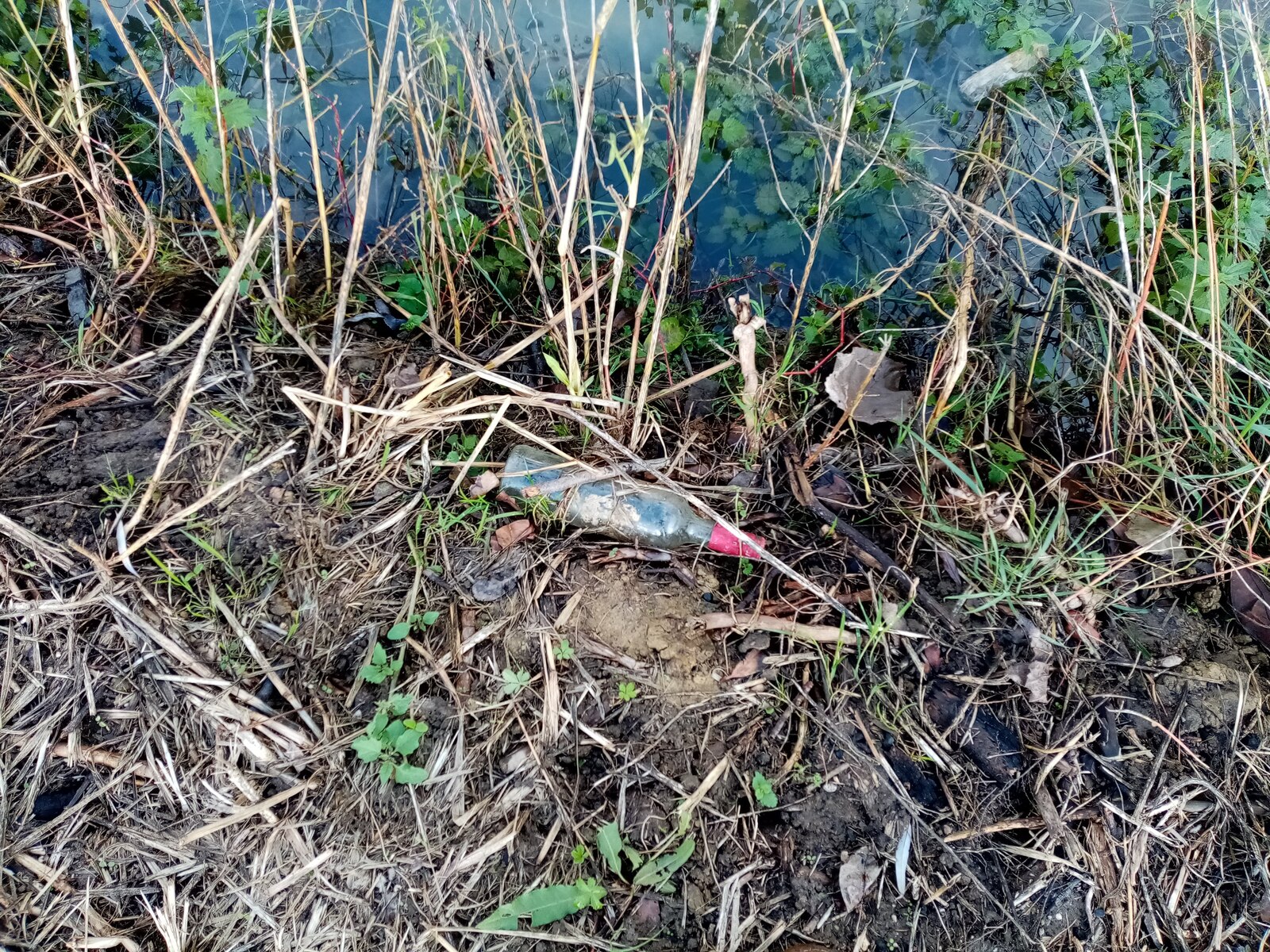 On trouve quelques déchets et des traces de combustion en bordure d'un ruisseau qui s'étale dans la zone humide, il a beaucoup plu ces jours derniers.