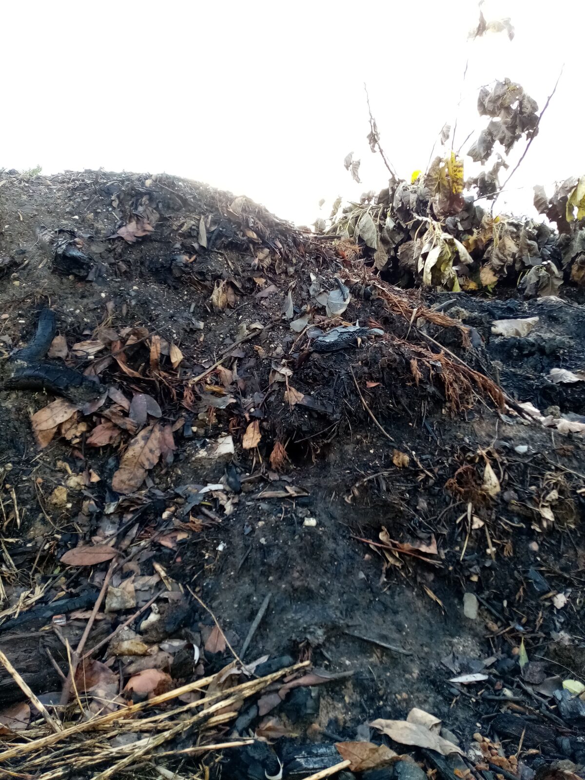 Tas carbonisé recouvert de déchets nouveaux, le tas sent encore la combustion.