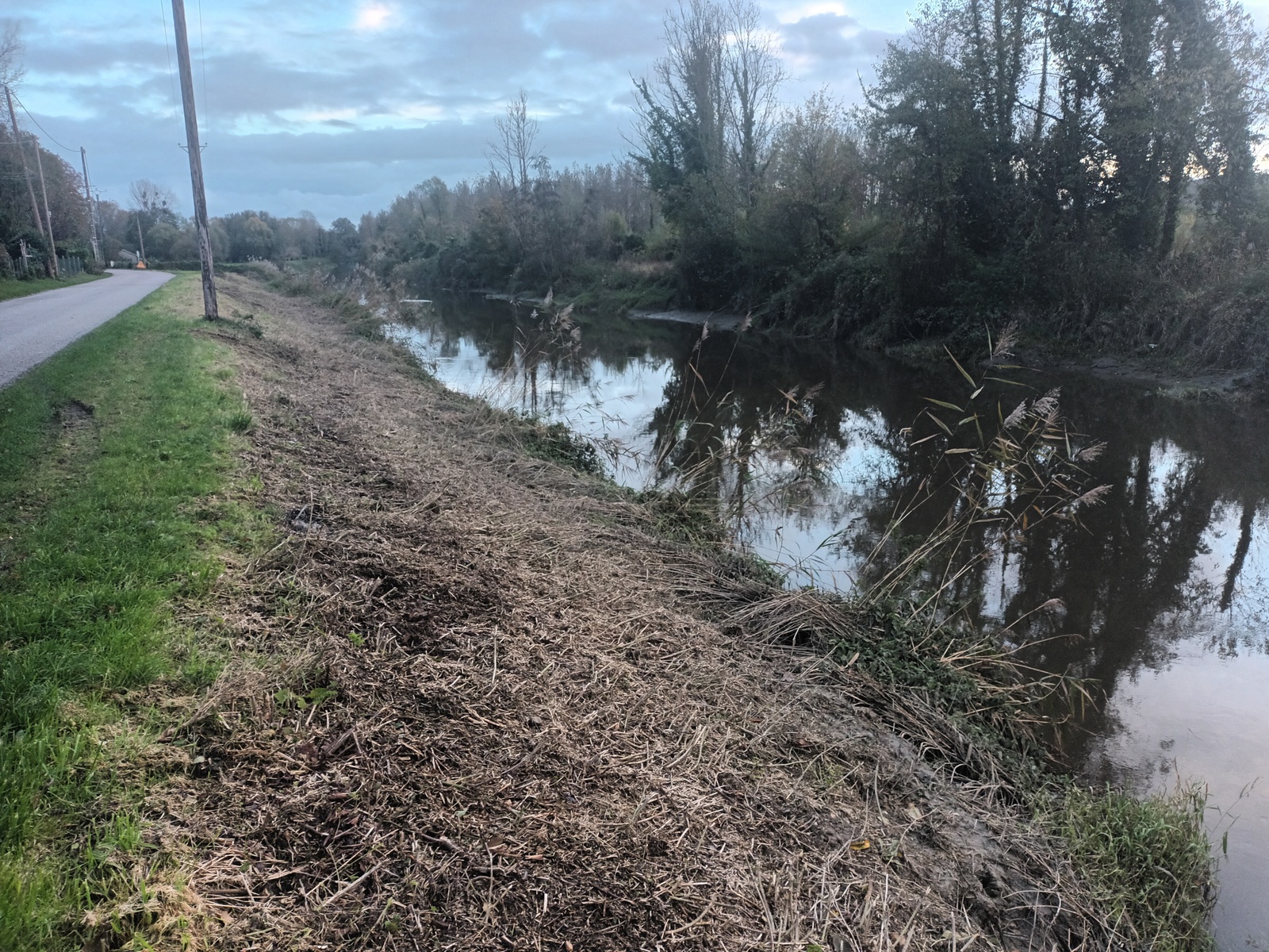 Taille de végétaux et plantes aquatiques le long de la route jusqu'aux rus, en bordure de la rivière de la Risle (zone humide agricole).