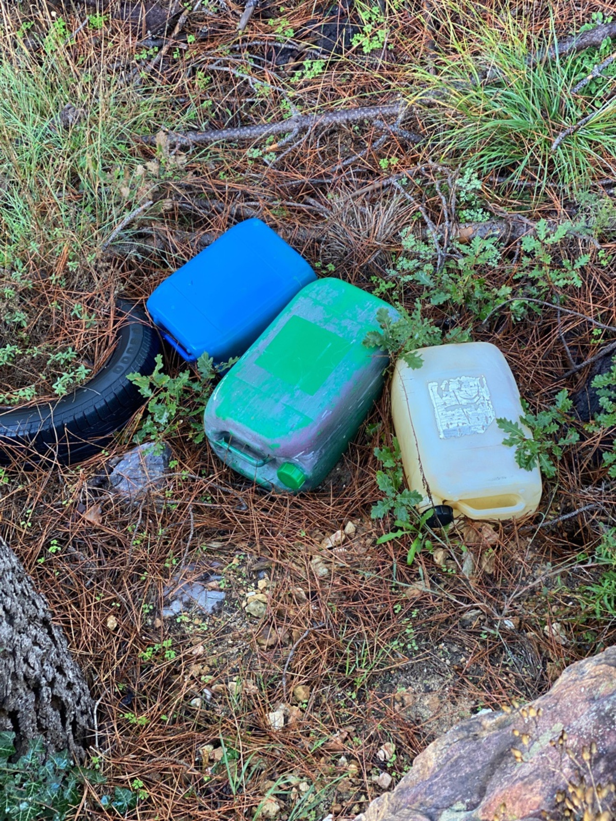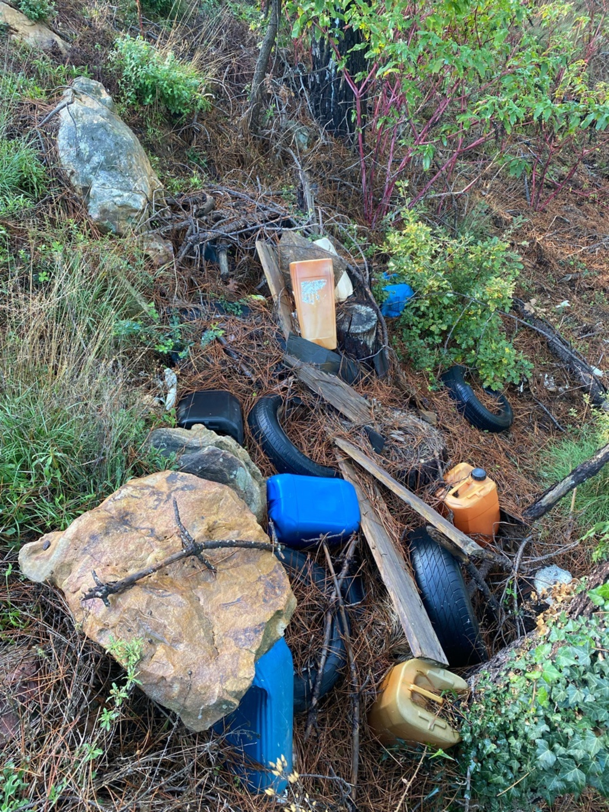 Dépôts de pneus et bidons en plastique dans une forêt à Mondragon.