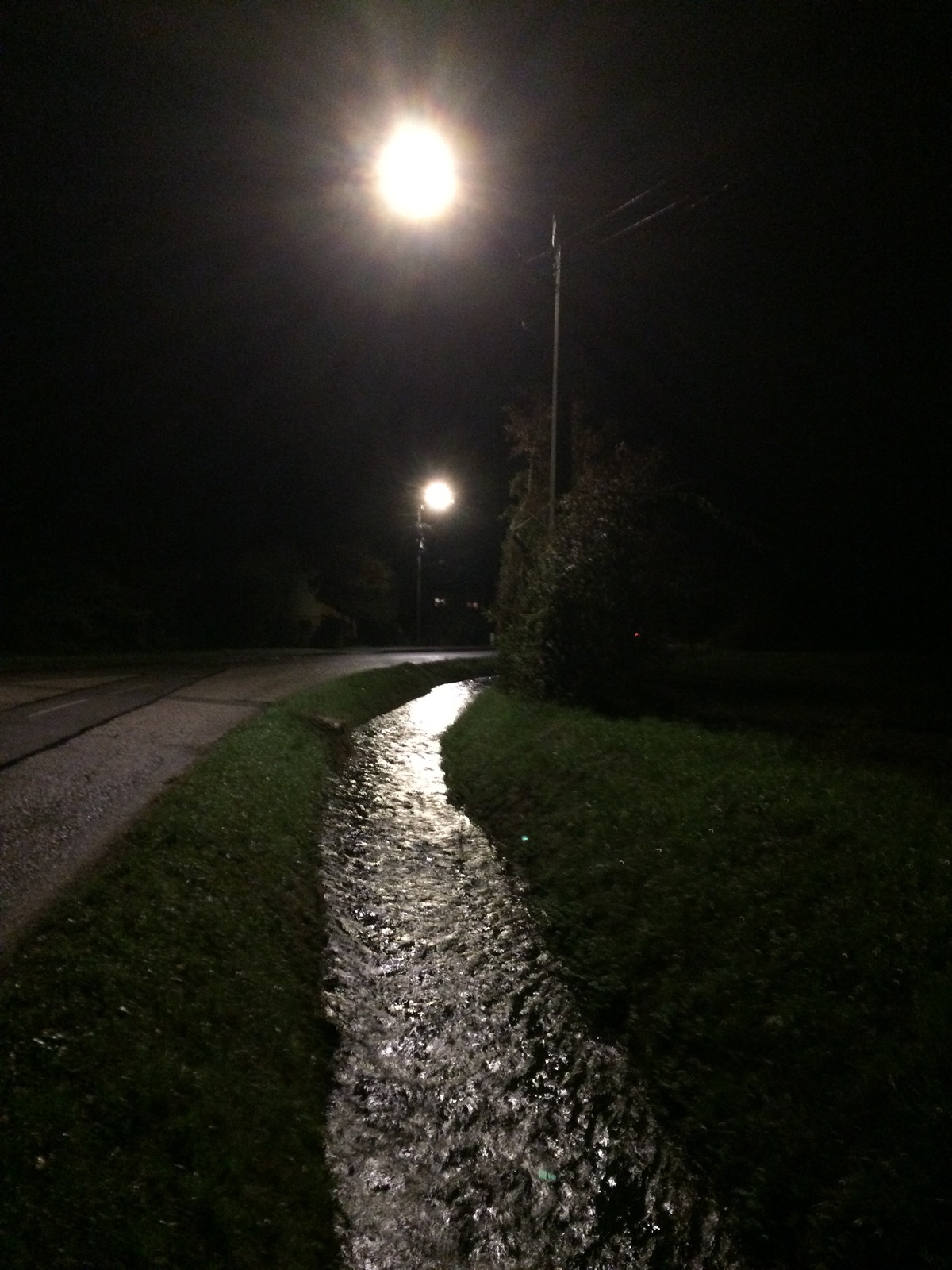 Pollution lumineuse constatée dans la commune de Saint-Genis-Pouilly, sur le cours d'eau du Lion. Lampadaire public éclairant un cours d'eau passant dans le fossé, affluent du Lyon : reflet de l'ampoule visible dans l'eau.