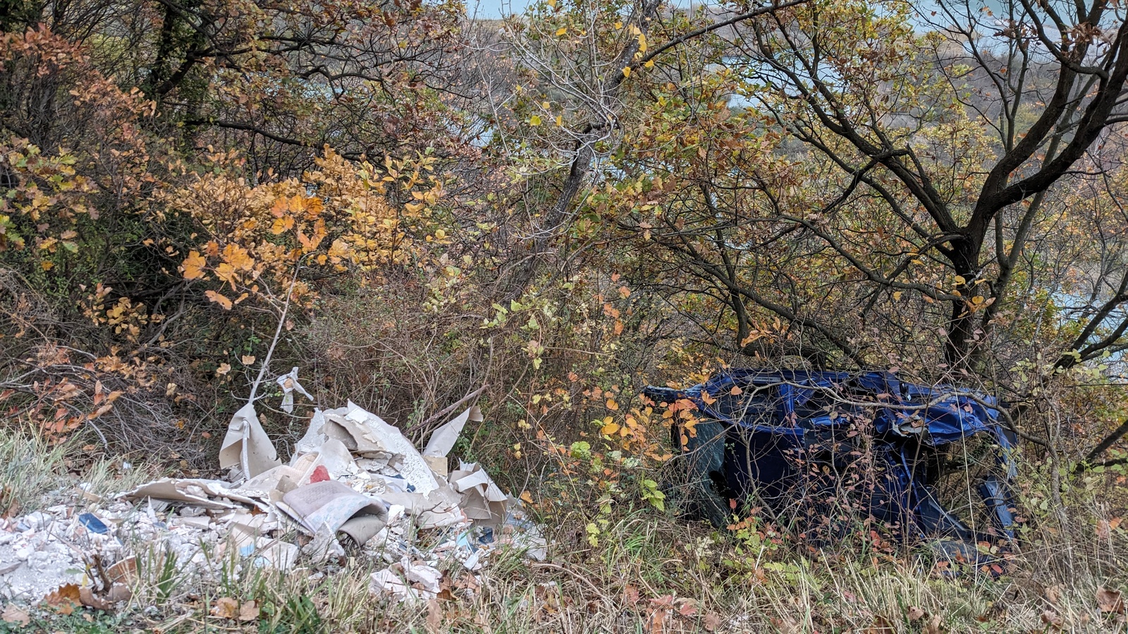 Dépôt d'une carcasse de voiture et dépôt de tas de gravats.