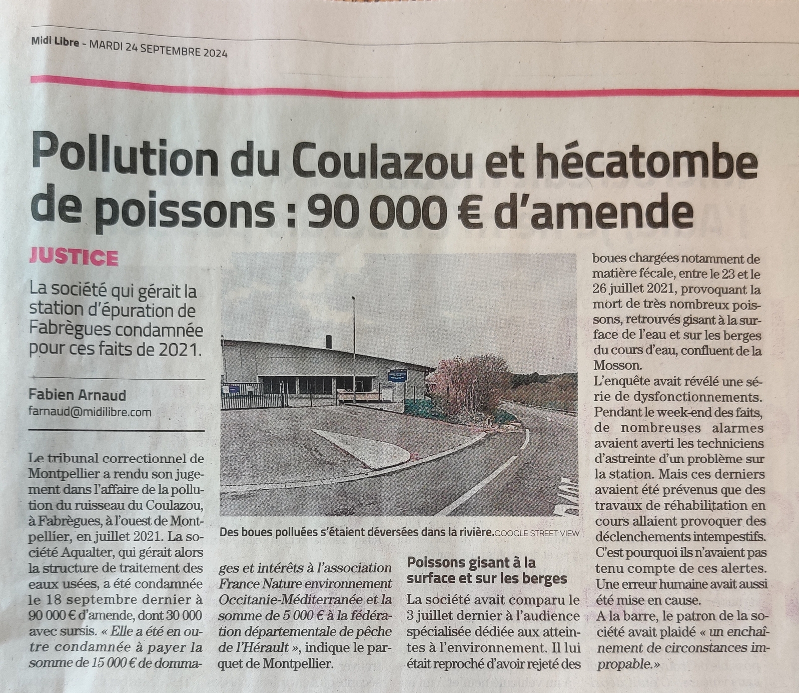 Le 18 septembre 2024, le tribunal judiciaire de Montpellier a condamné la société Aqualter, ex-gestionnaire de la station d’épuration de Pignan-Saussan-Fabrègues, à une amende de 90 000€ dont 30 000€ avec sursis. FNE OcMed obtient 15 000€ de dommages et intérêts.