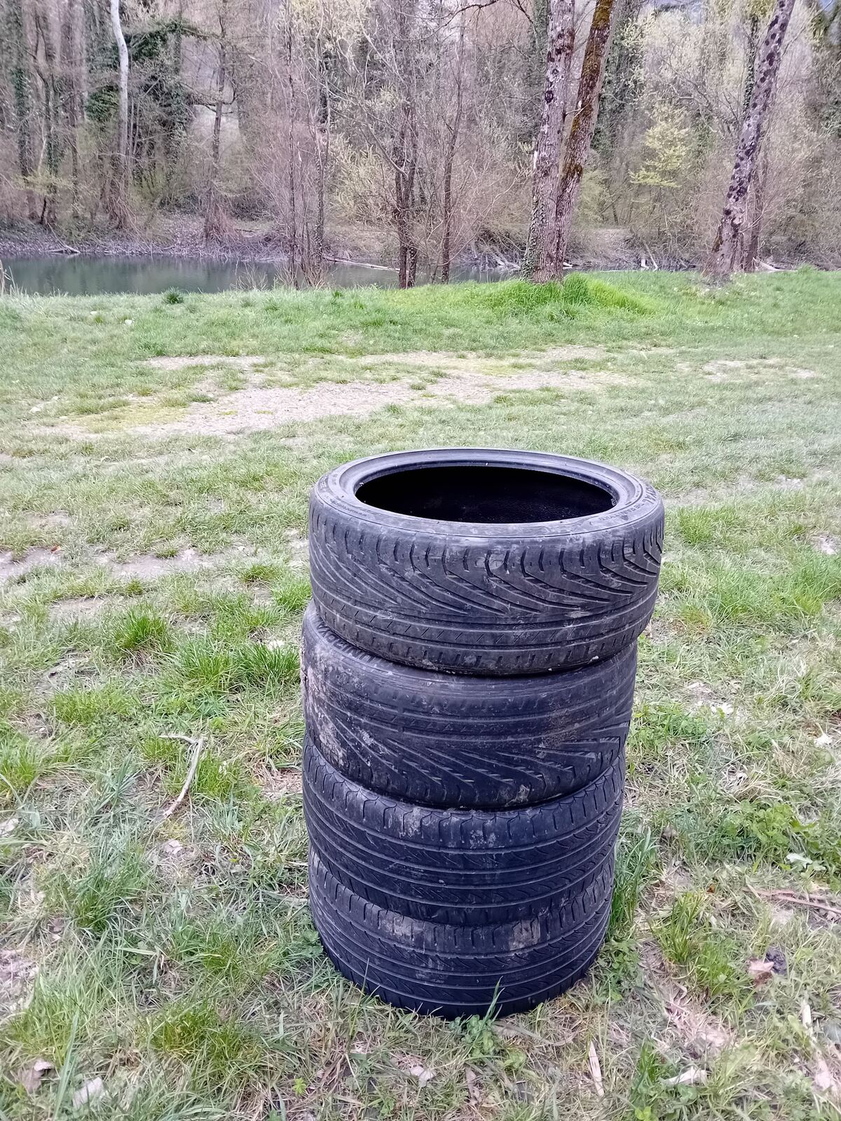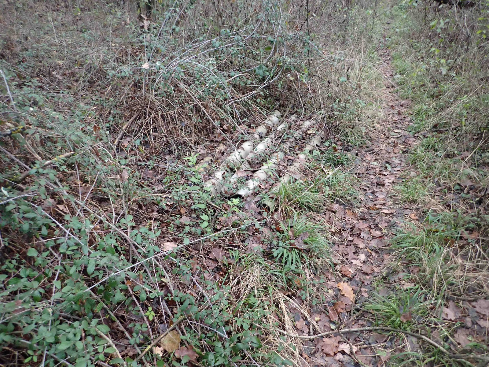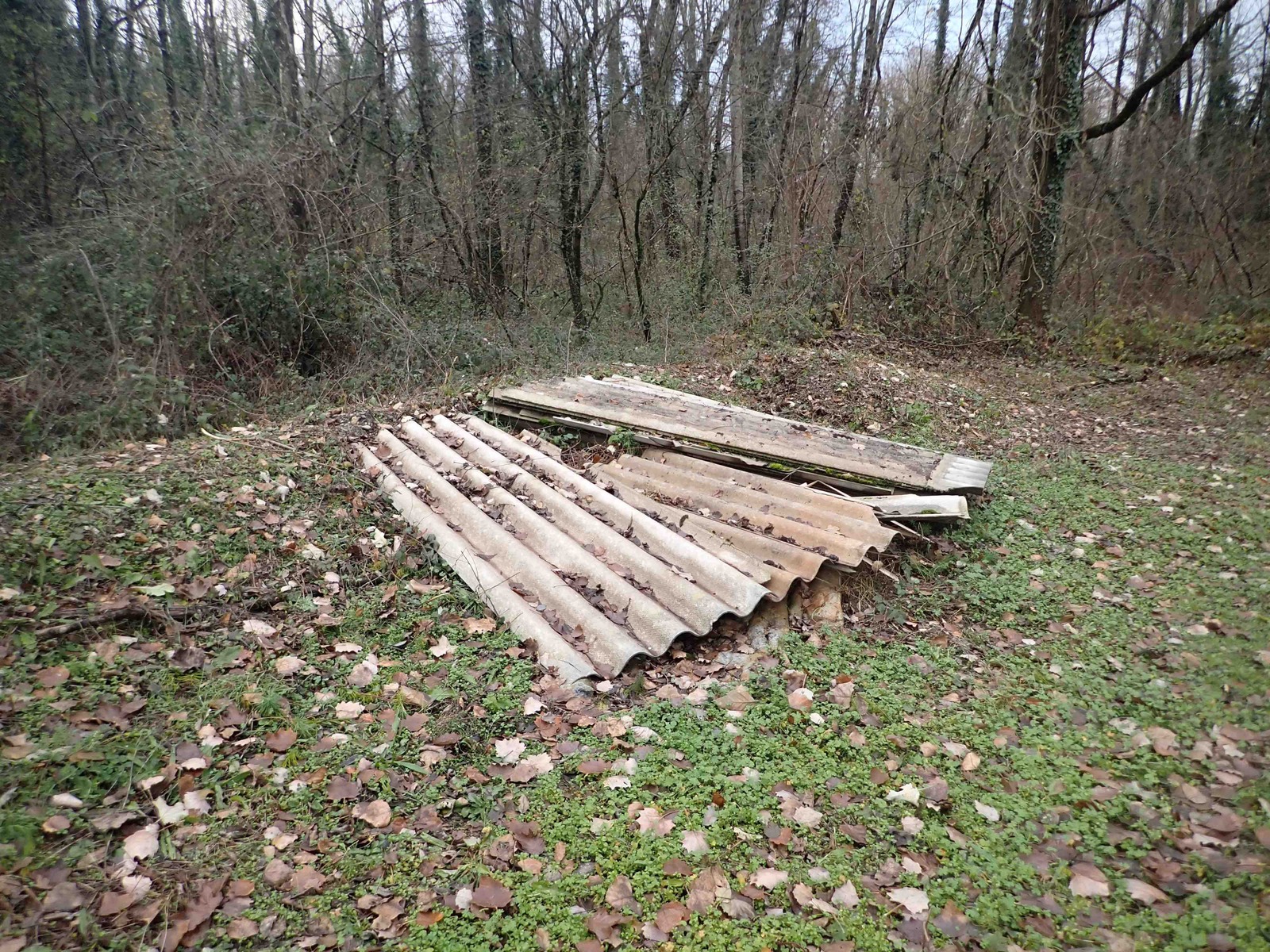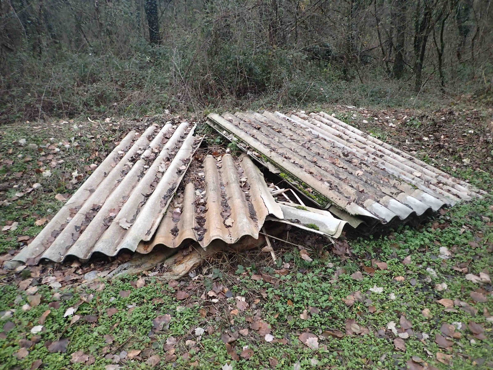 Plusieurs plaques d'Evérite (matière renfermant de l'amiante, empilées au bord de l'étang du Grand Glairon et prés de chemin au sein de l'ENS voisin.