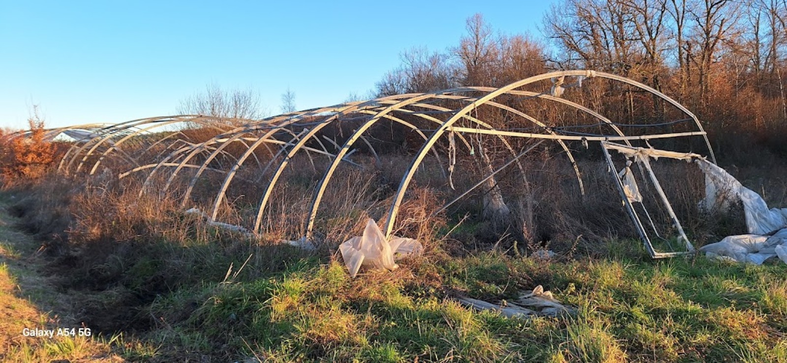 Des serres tunnels ont été laissées à l'abandon le long de la route de Champier à Pisieu. De nombreux tubes avec arceaux , caoutchouc, tuyaux et films plastiques jonchent le sol, sur une superficie importante.