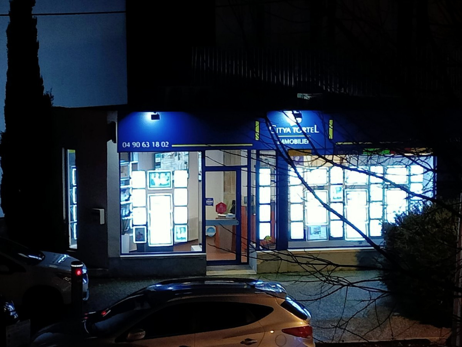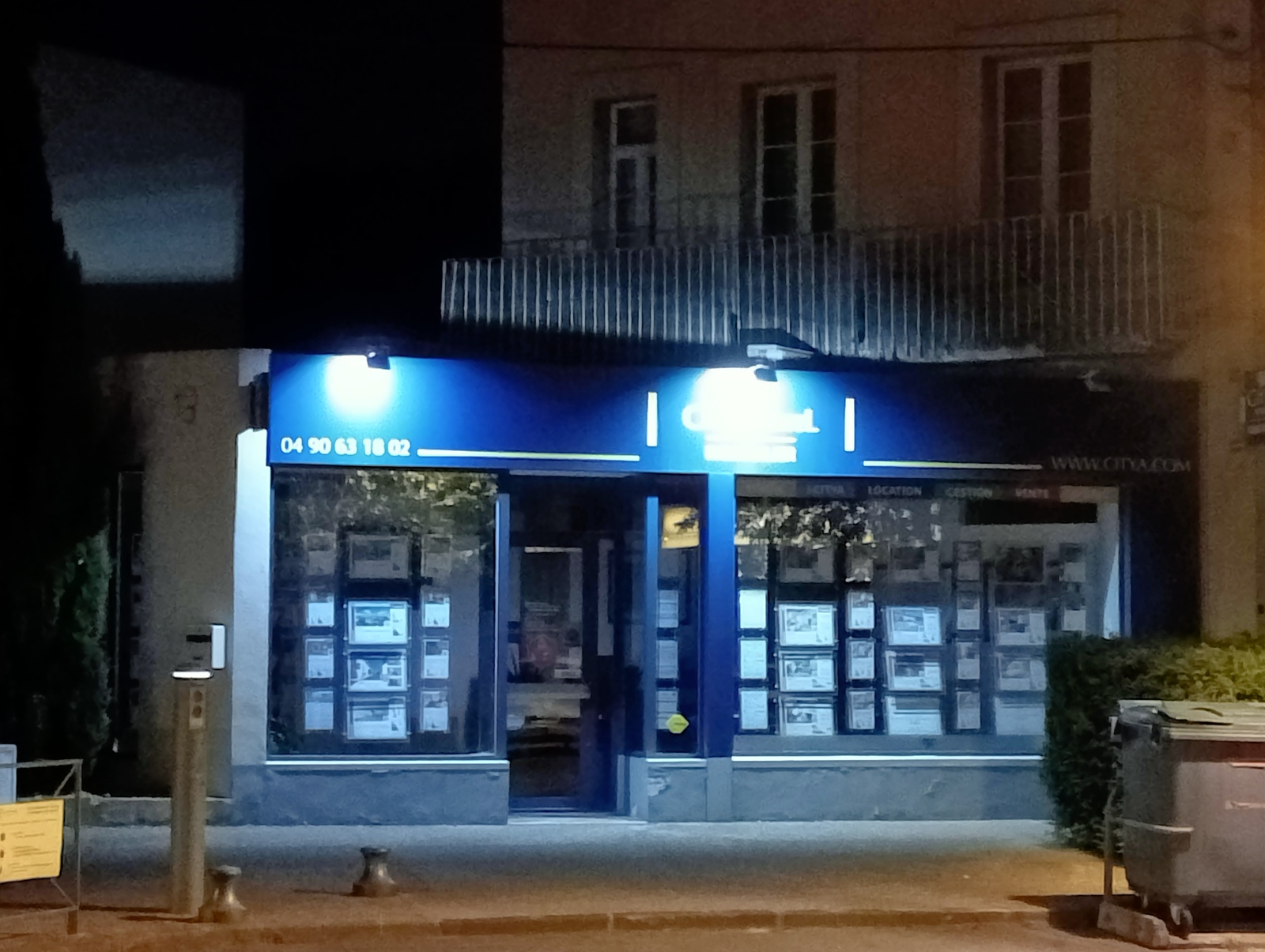 Pollution lumineuse : agence immobilière éclairée toute la nuit à Carpentras.