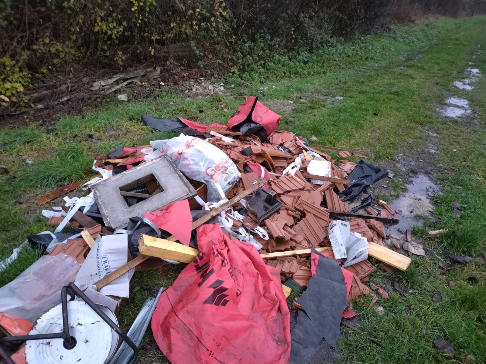 Dépôt de 2m2 de déchets divers : tuiles, plastiques, restes de chantier.