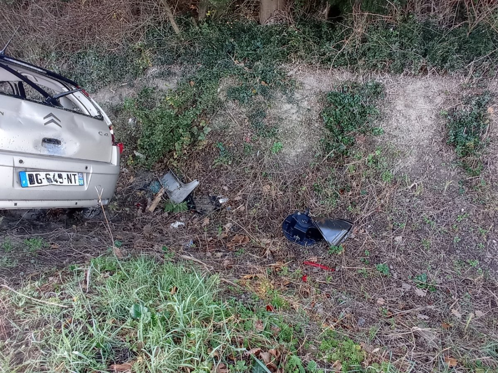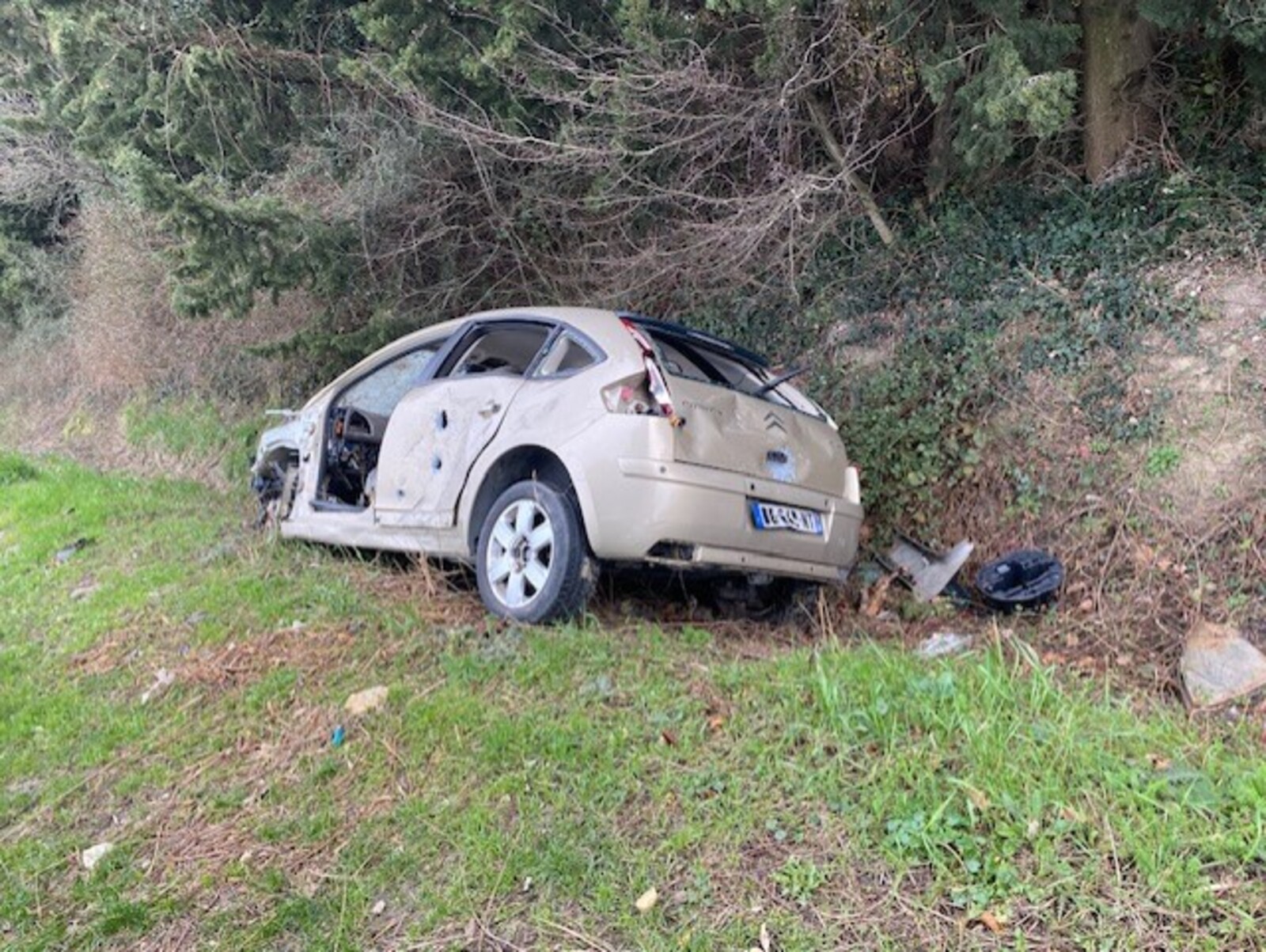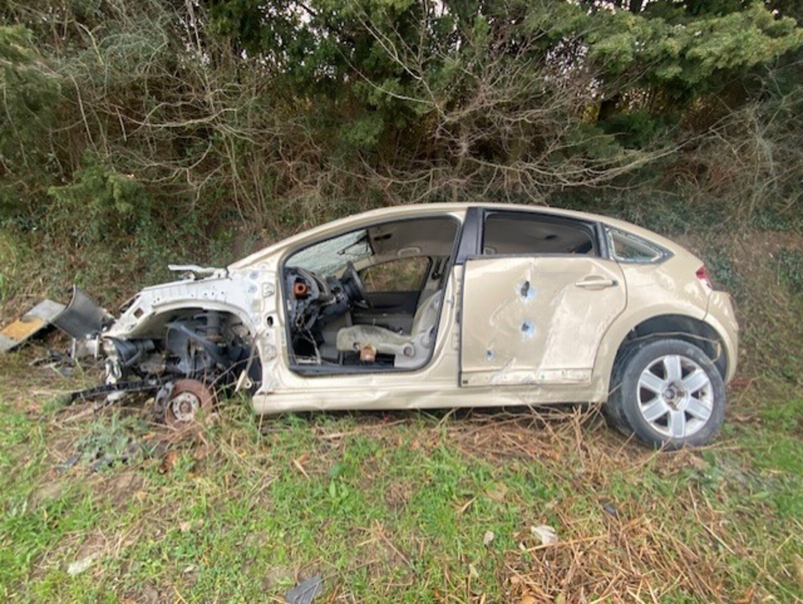 Epave de véhicule accidenté (citroen C4) en bord de route à Mondragon.
