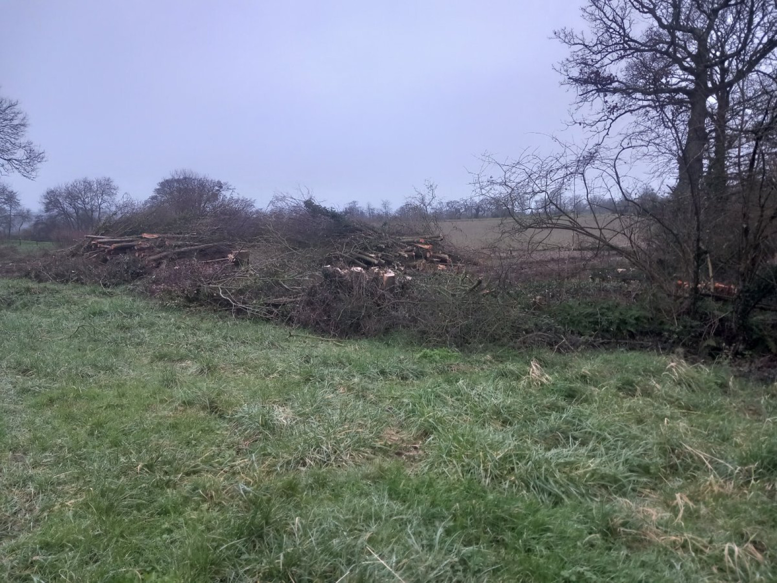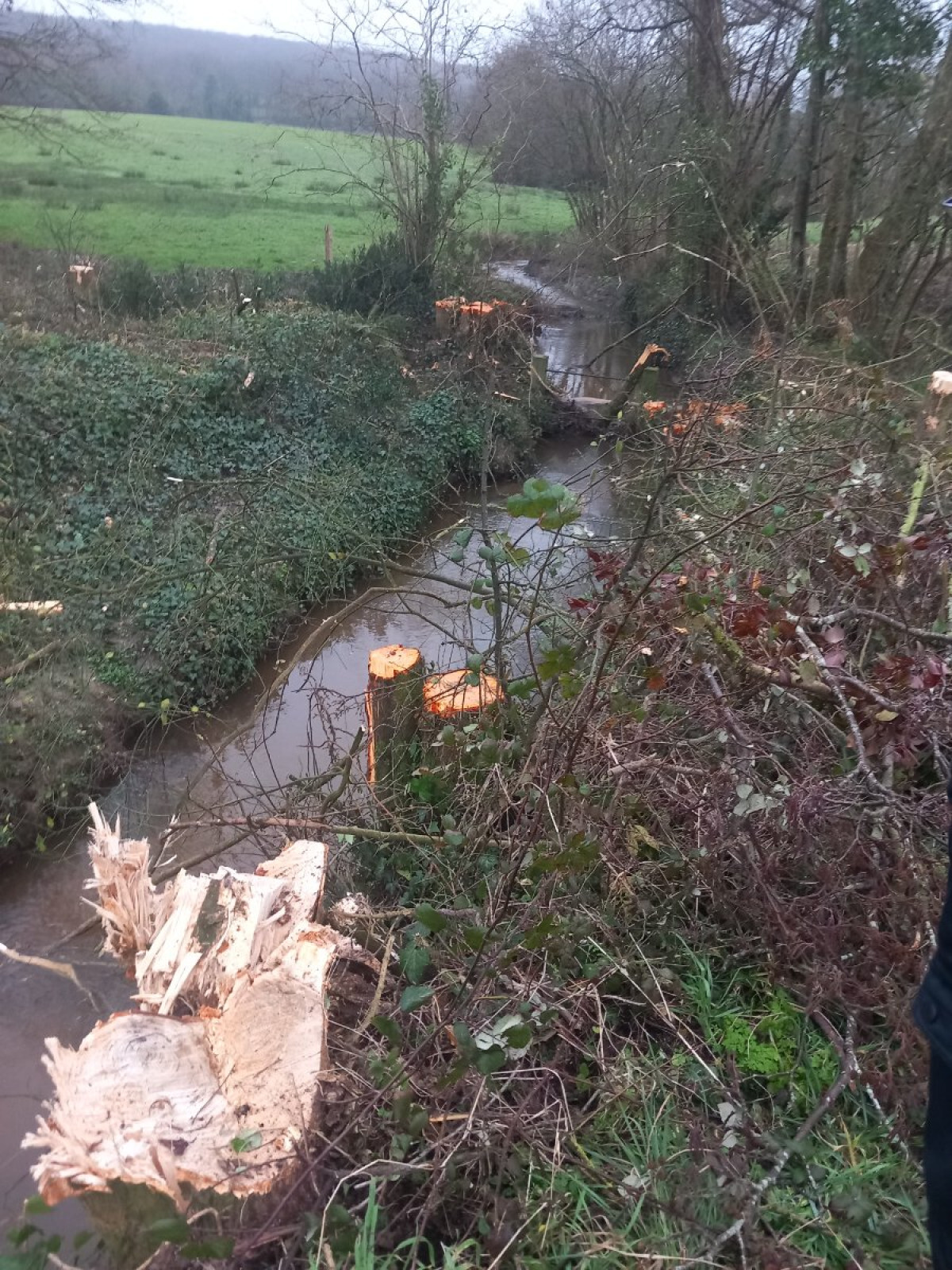 Coupe à ras de haies et arbre en bordure de cours d'eau sur tout le pourtour d'une parcelle agricole.