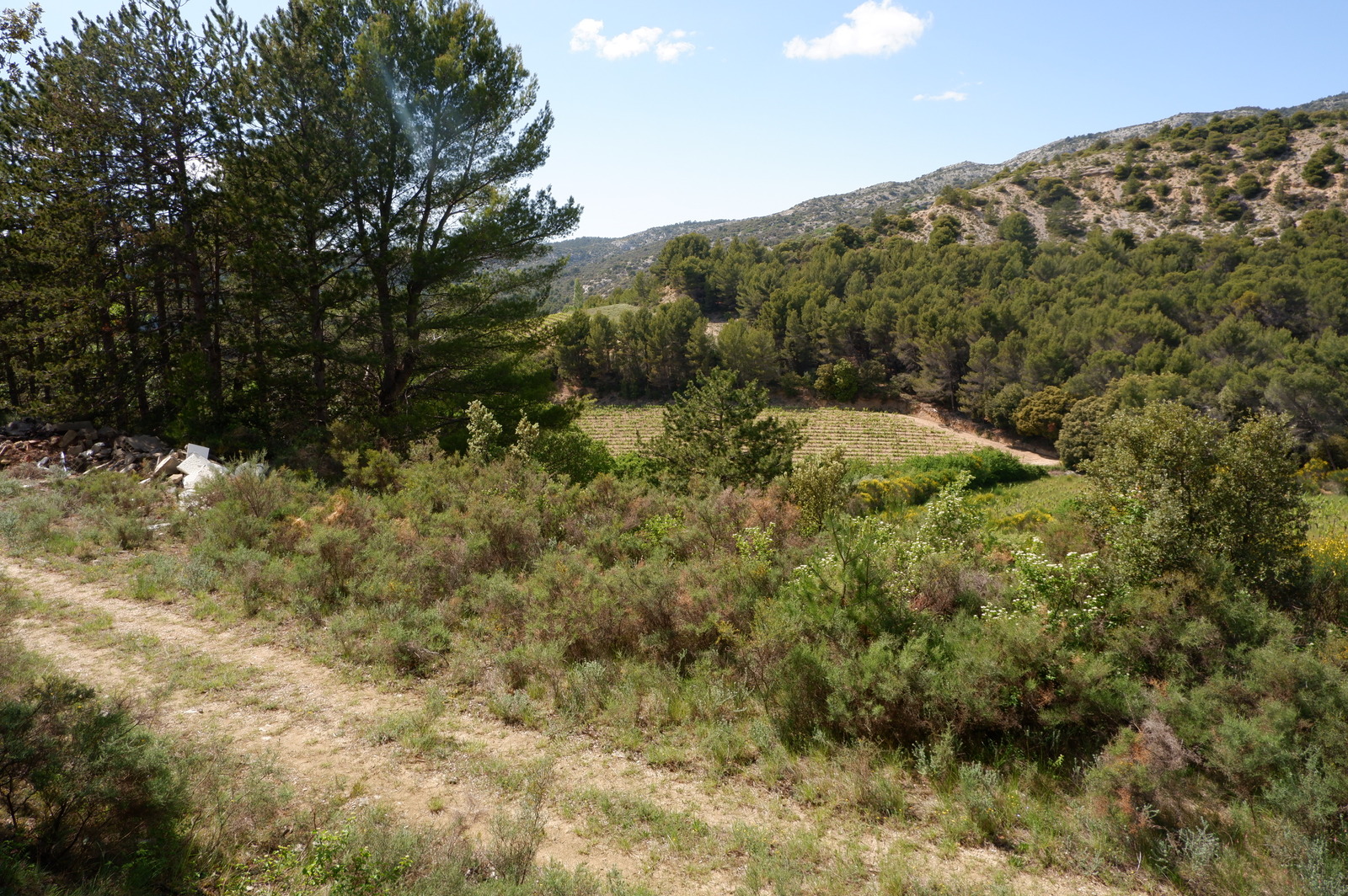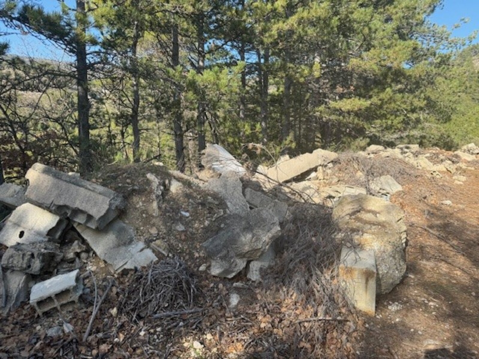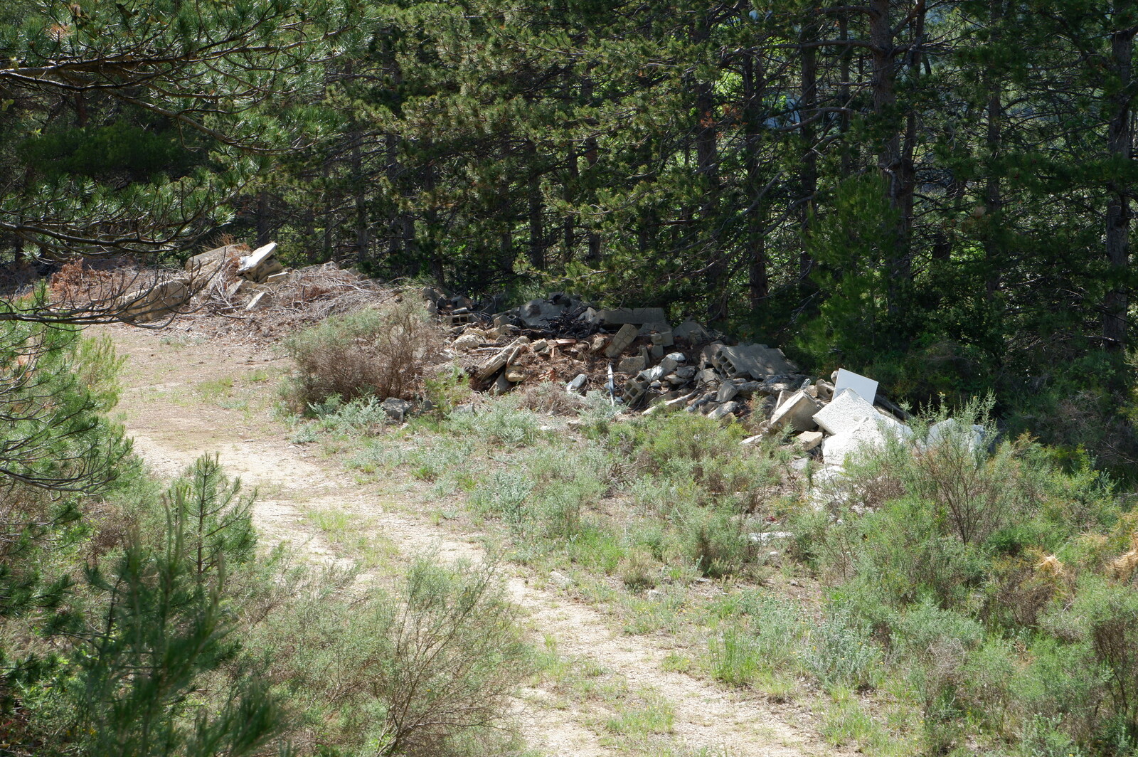 Dépôt de gravats dans une zone boisée à proximité de terres viticoles.