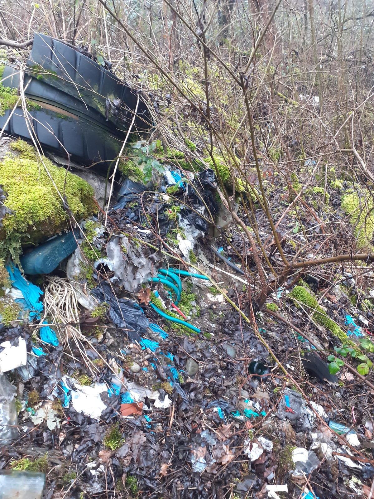 Dépôt de déchets conséquent et composé de pneus, plastiques divers, frigo ou encore de canettes sur plusieurs niveaux. Ce dépôt se trouve au bord du Rhône donc risque important de pollution du Rhône.