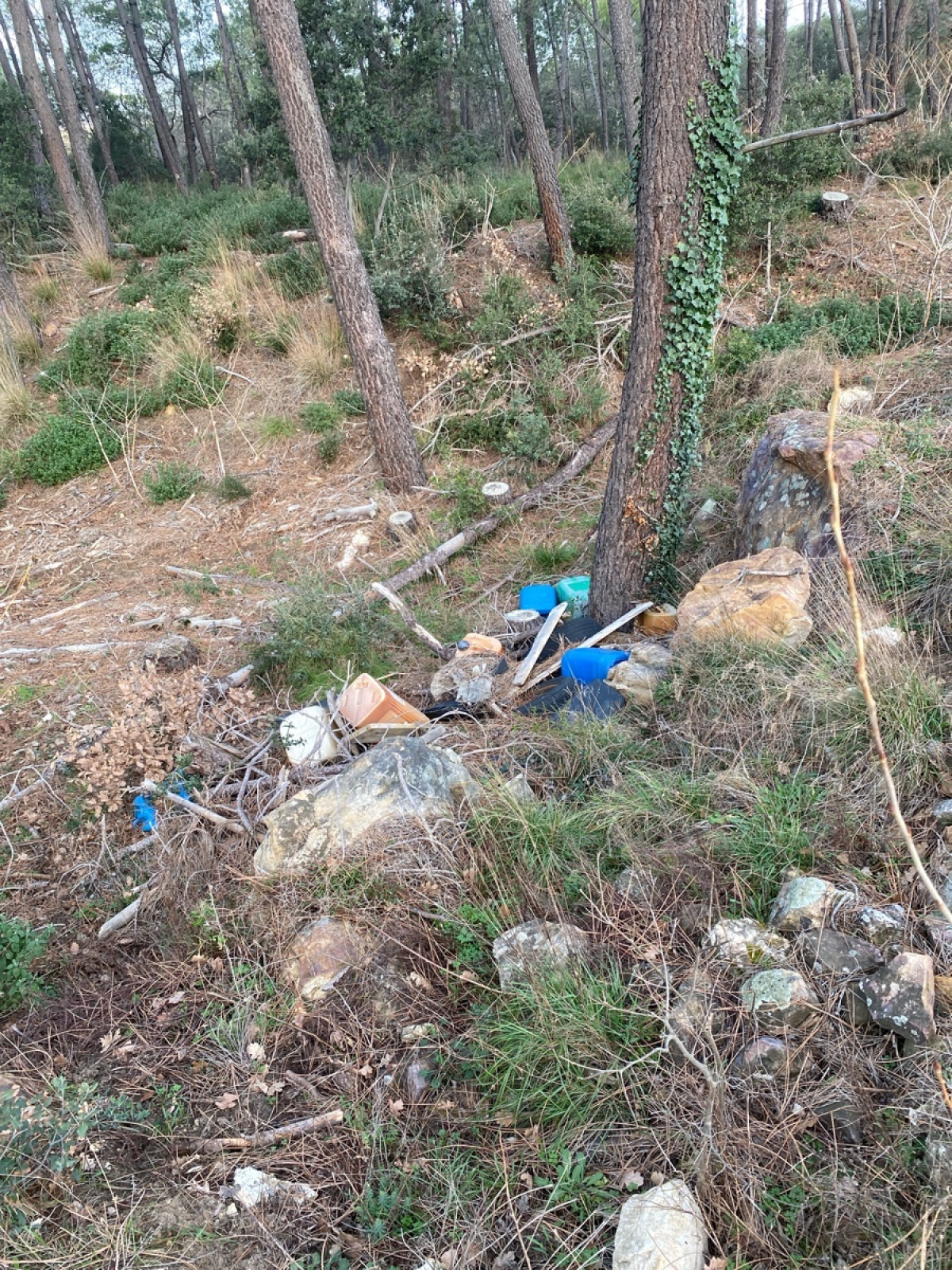 Dépôts de pneus et bidons en plastique dans une forêt à Mondragon.