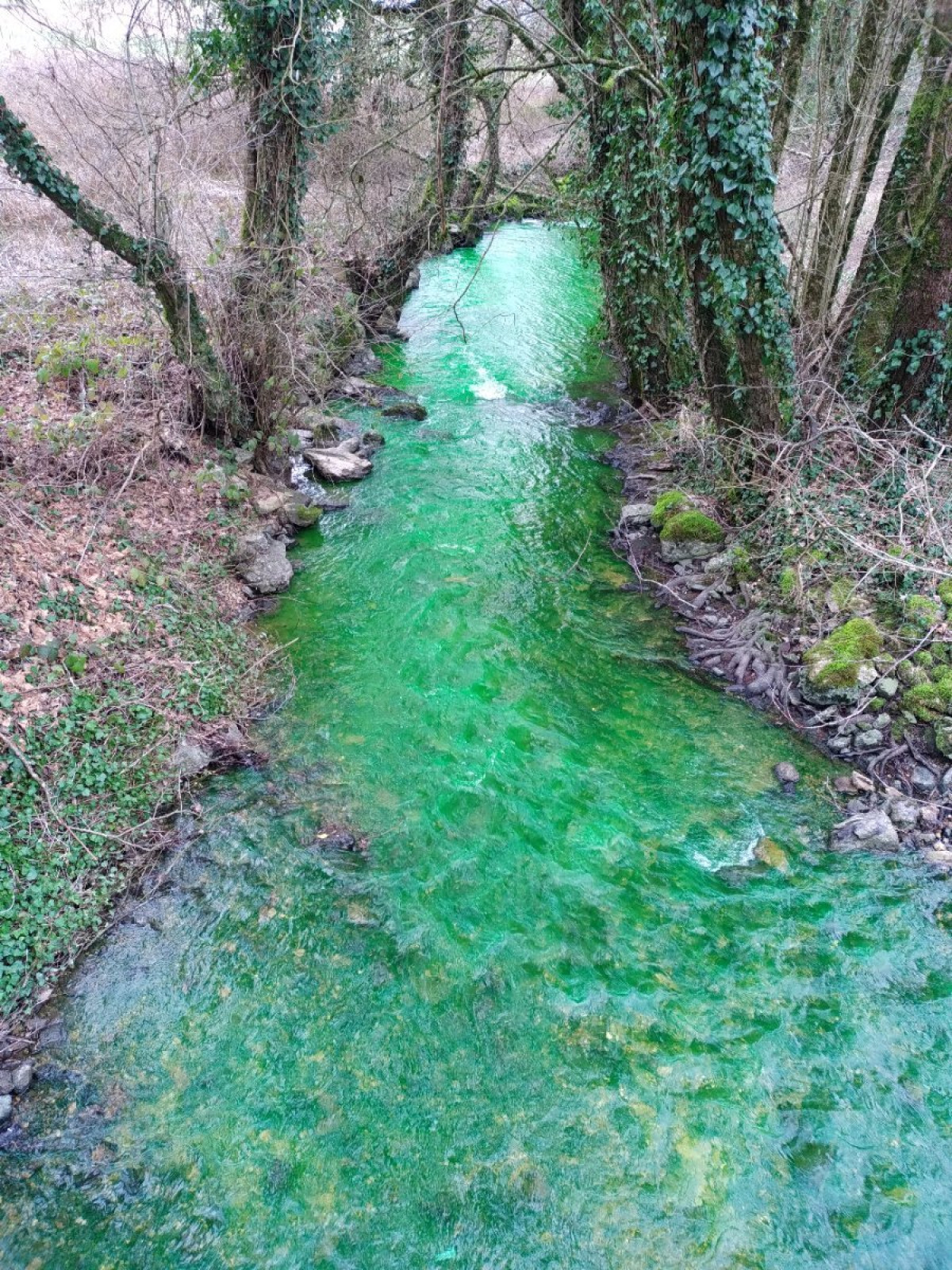 La rivière a été teintée d'une couleur vert fluorescent sur plusieurs kilomètres.