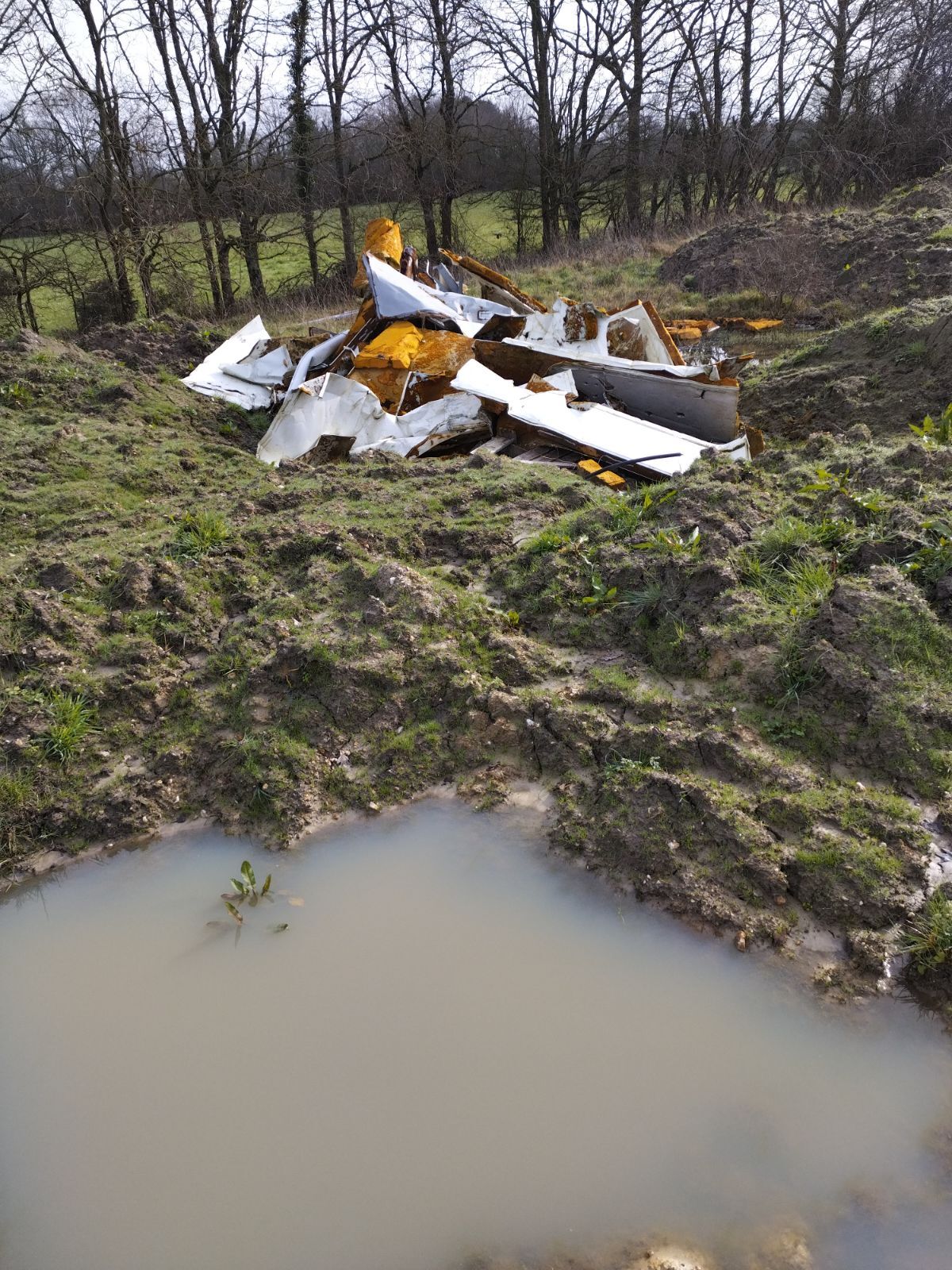 Remorques, bois, reste d'algeco, poutres métalliques enfouis sous de la terre.
