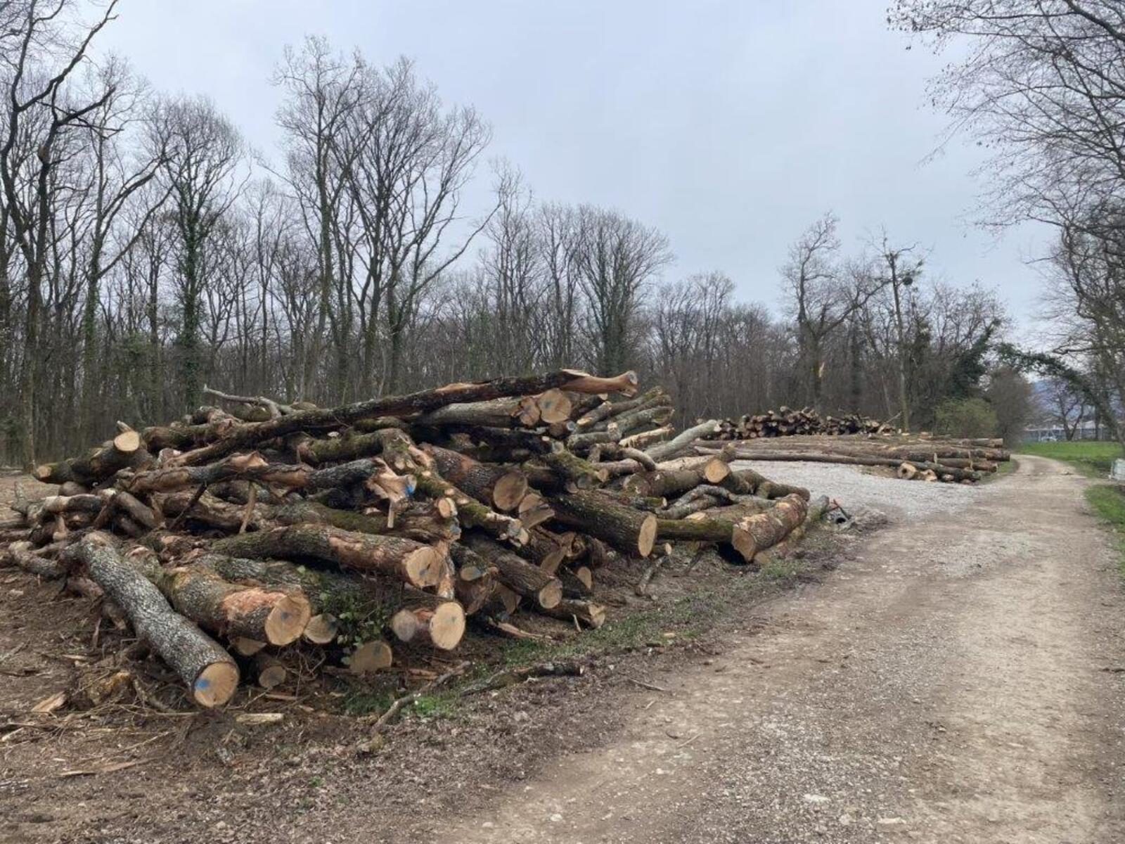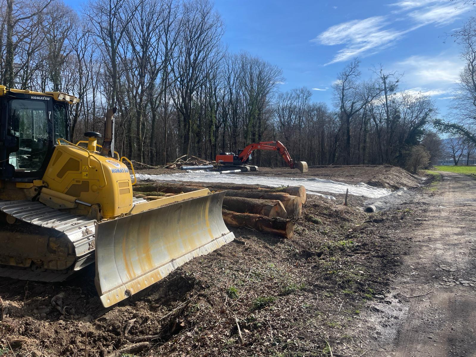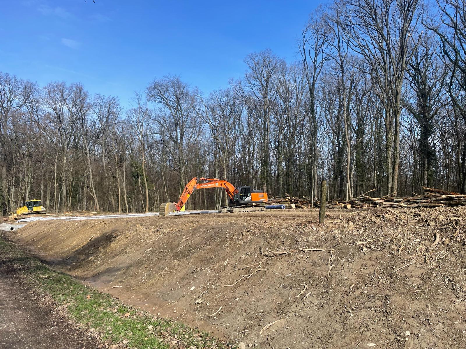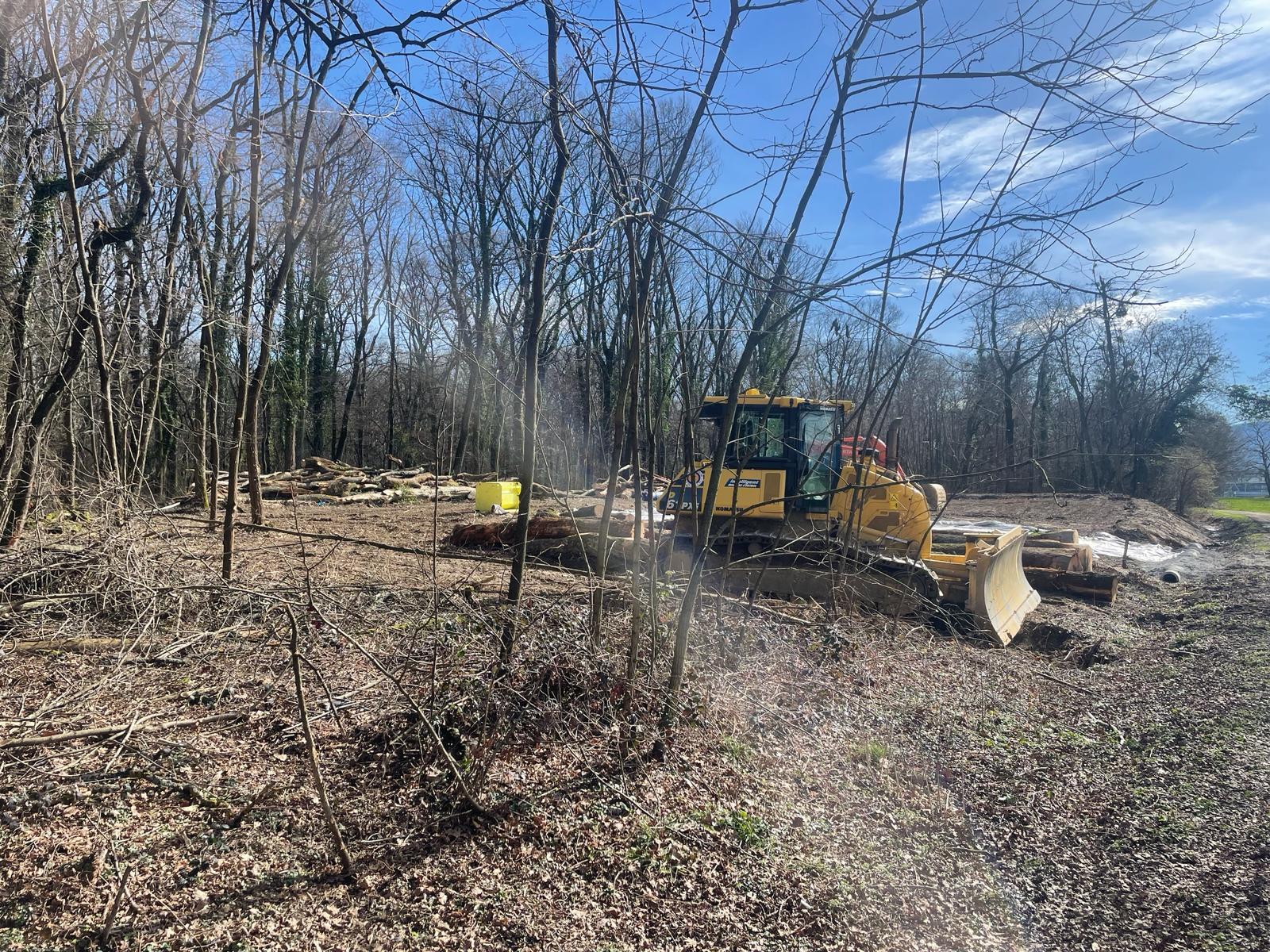Coupe rase et aménagement avec divers engins dans le Bois de la Bagasse à Ferney-Voltaire.