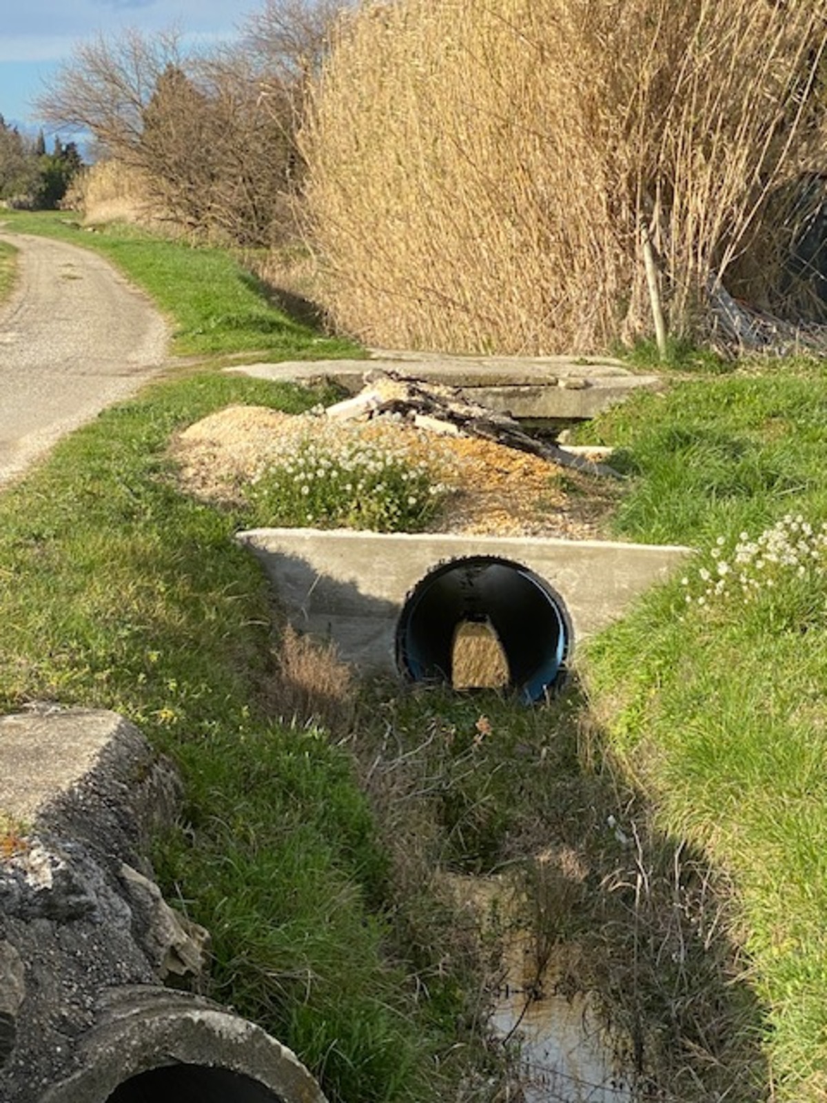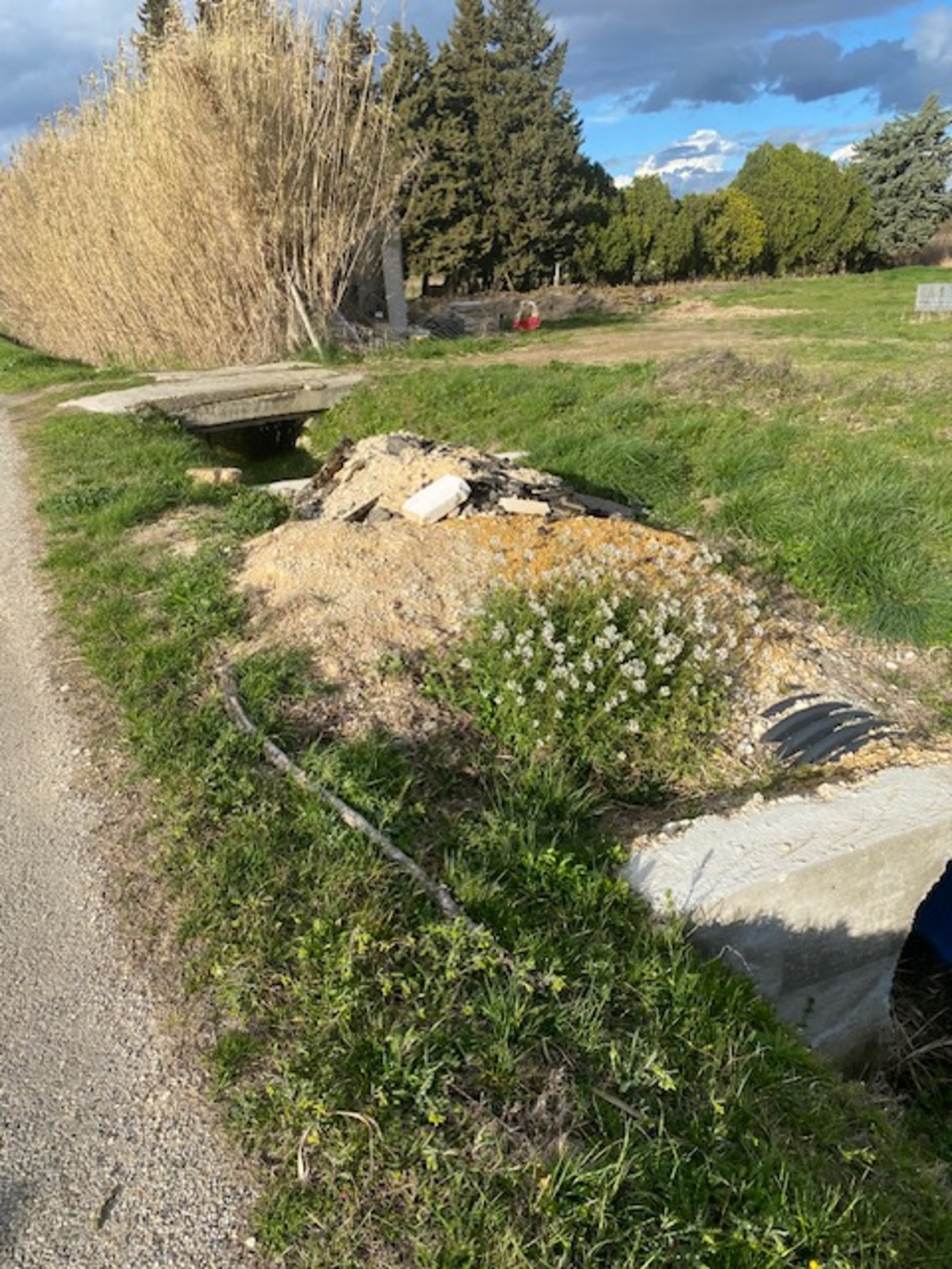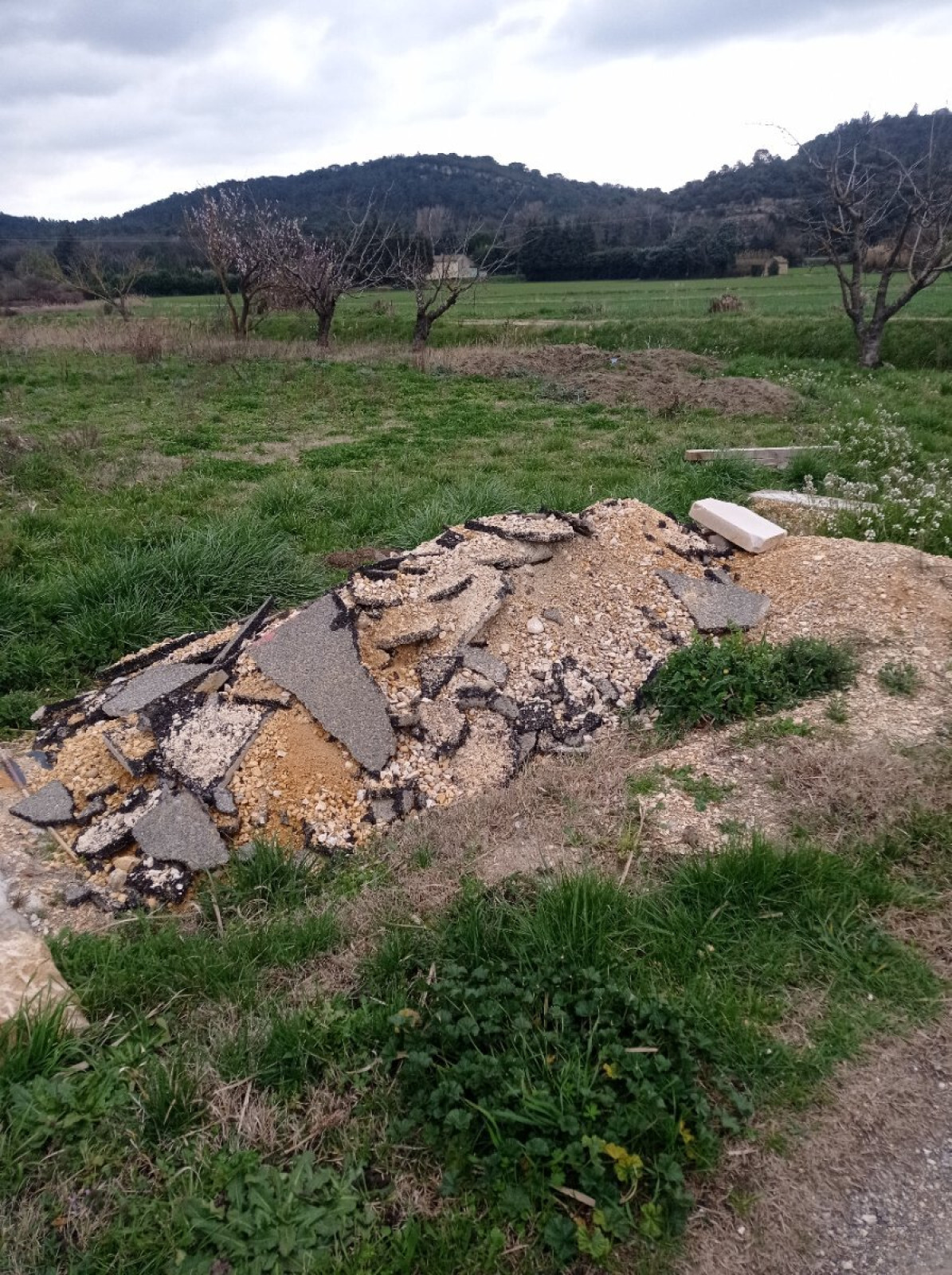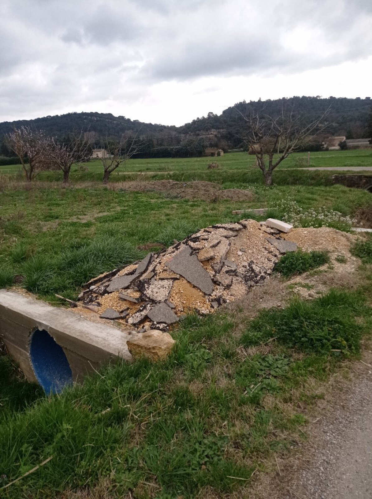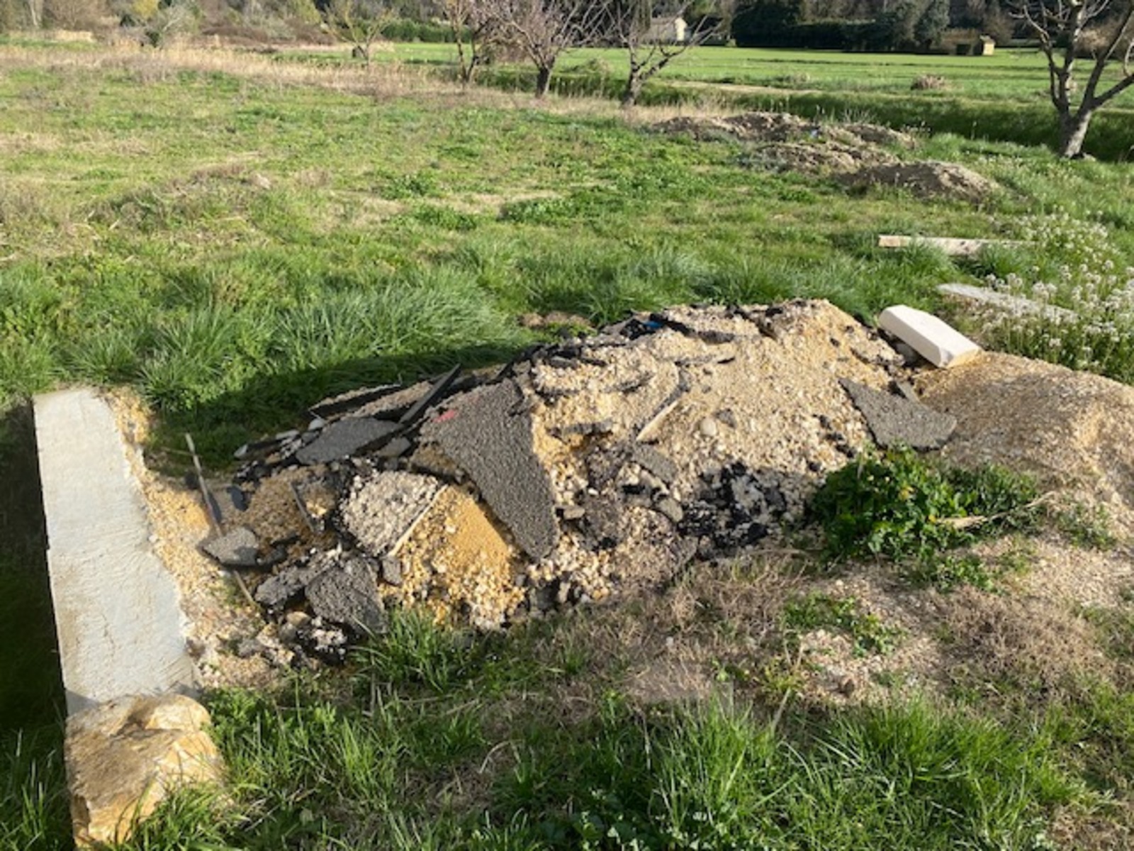 Tas de gravats au bord d'un terrain, au-dessus d'un ruisseau, à Mondragon.