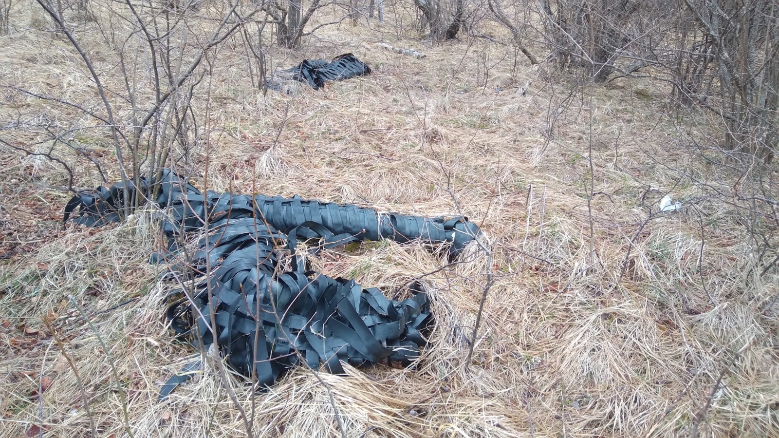 Deux grands rouleaux de plastique noir (200 kg) sont abandonnés à 200 m d'une piste forestière.