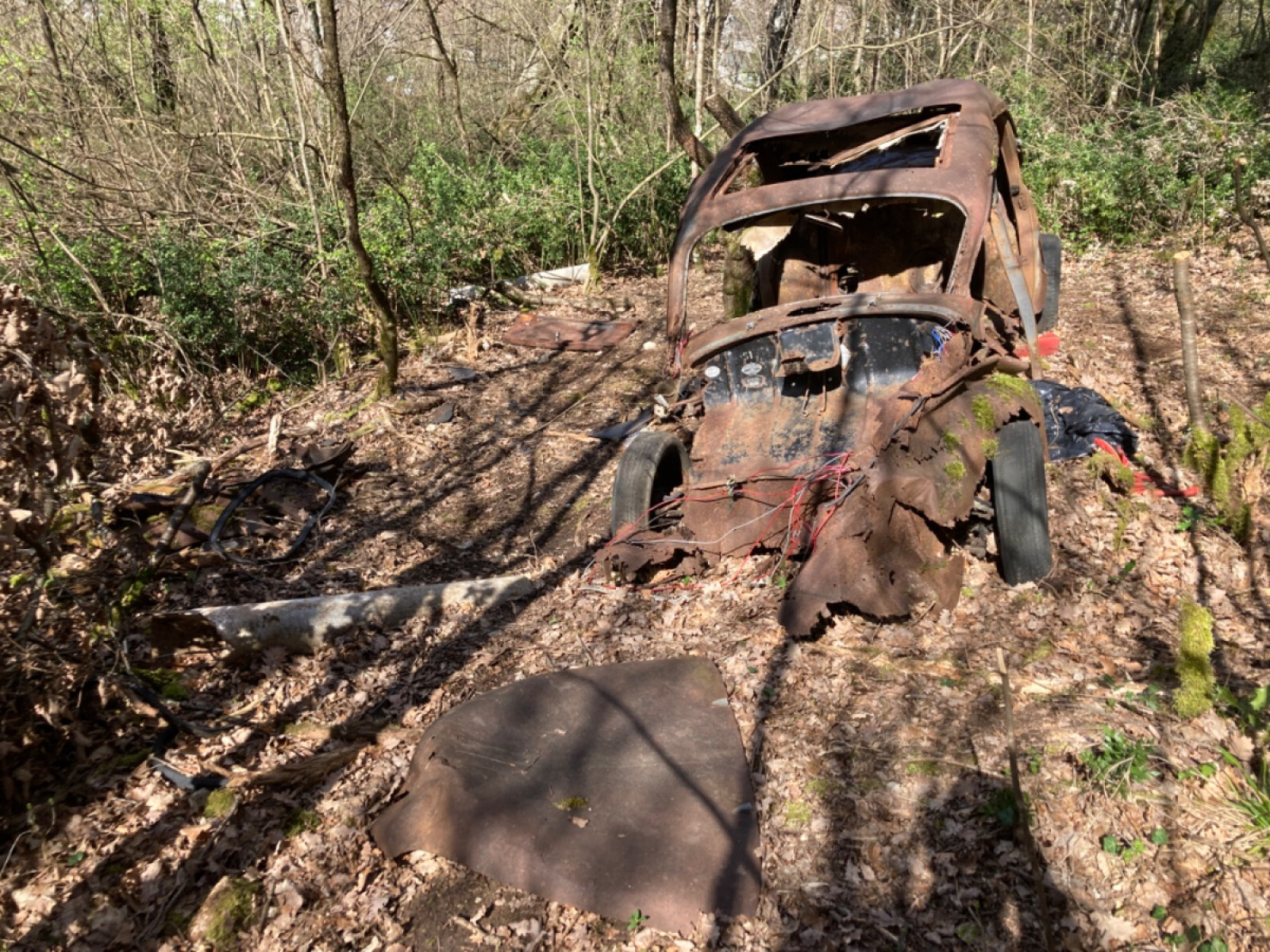 Carcasse de voiture avec ses composants étalés en dehors.