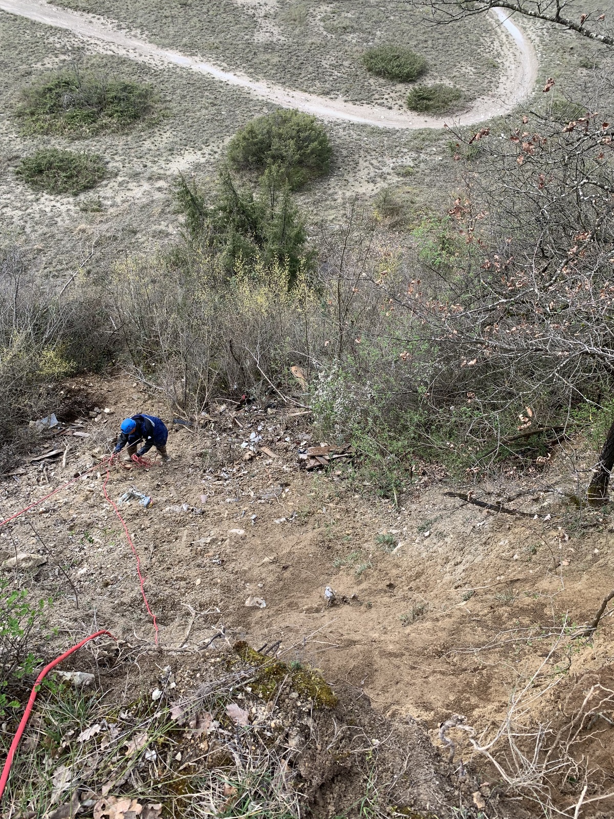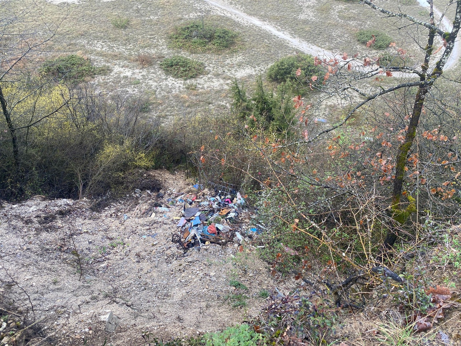 Décharge sauvage constituée de déchets divers. Les déchets ont été déposés avec un camion benne depuis un chemin qui surplombe une ancienne carrière réhabilitée en espace naturel (classé en Znieff et Natura 2000.).