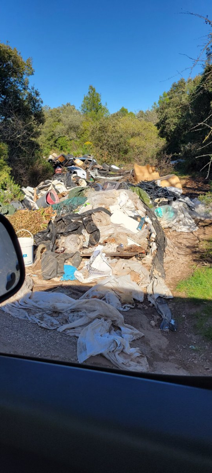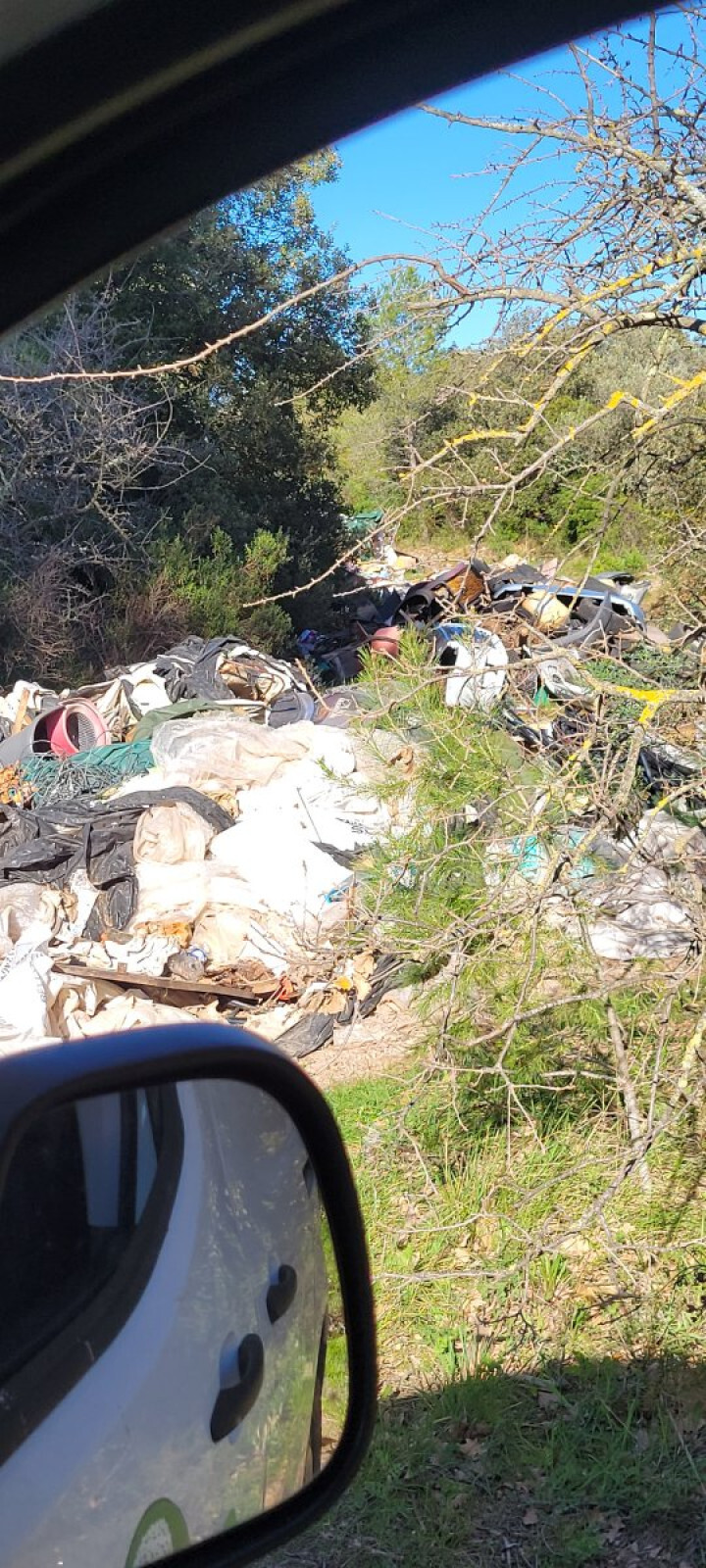 Gros dépôt sauvage de déchets, déchets de tous types visibles depuis la route.