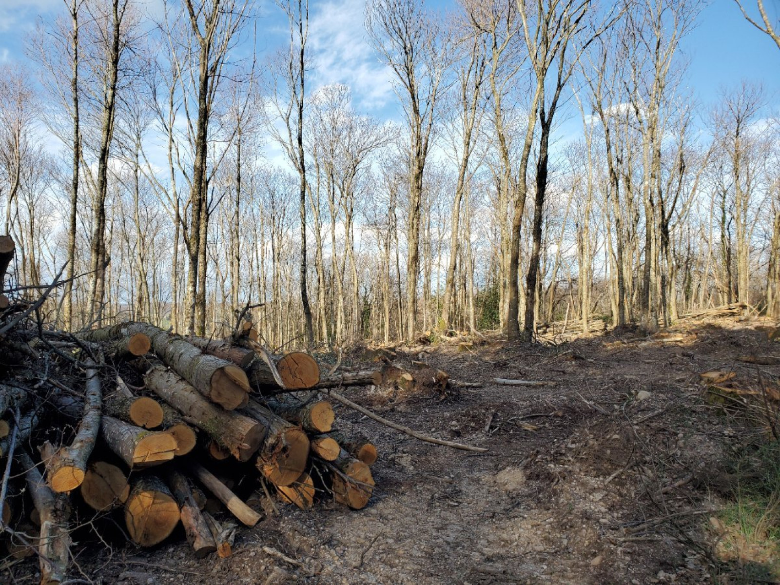 Sur le chemin de randonnée allant de Savas-Mépin à Villeneuve-de-Marc, des coupes rases d'arbres ont été faites tous les 500 mètres, la forêt est presque entièrement rasée.