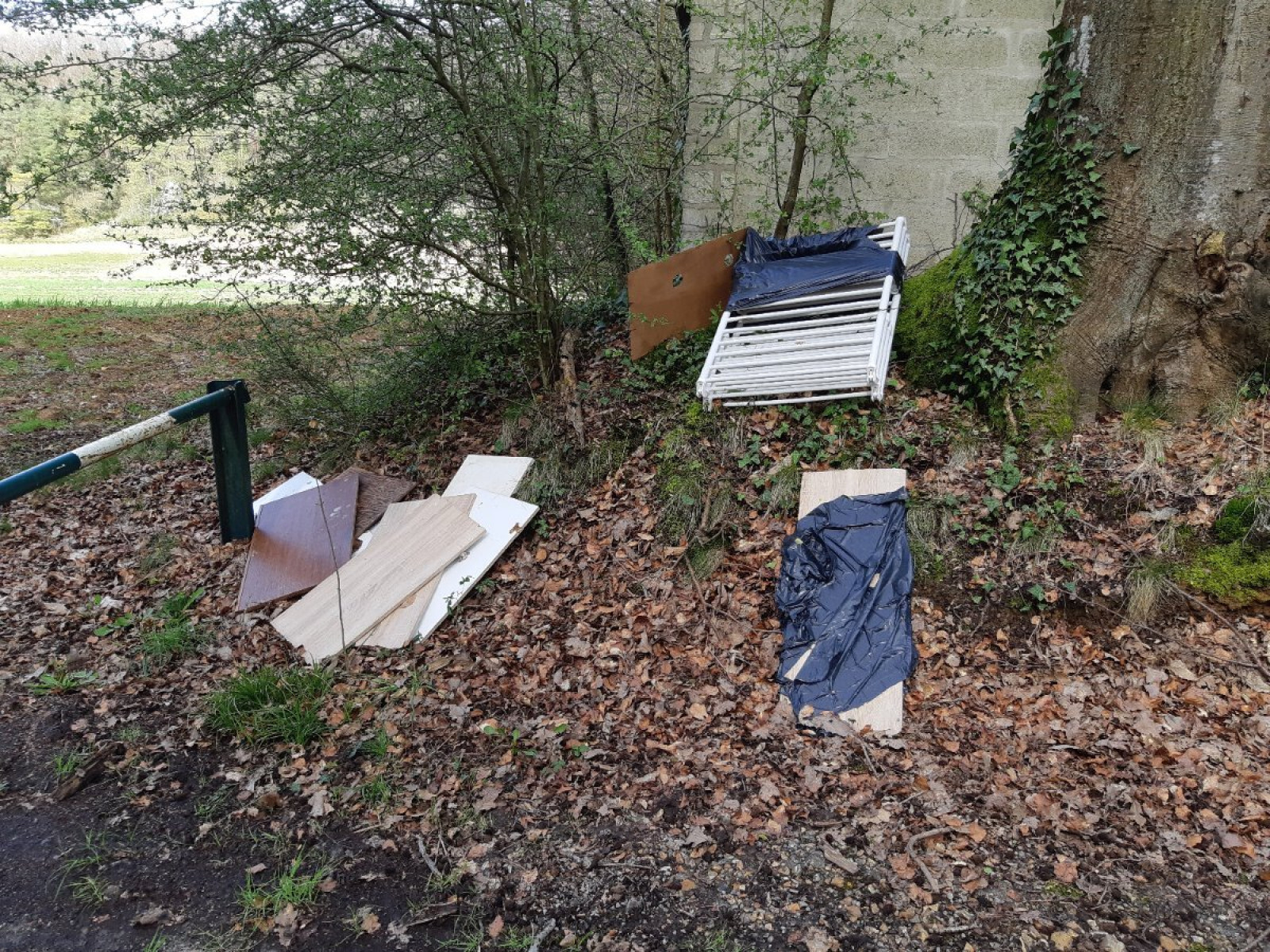 Dépôt de déchets en zone boisée : Portes de placard de cuisine aggloméré + sèche-linge