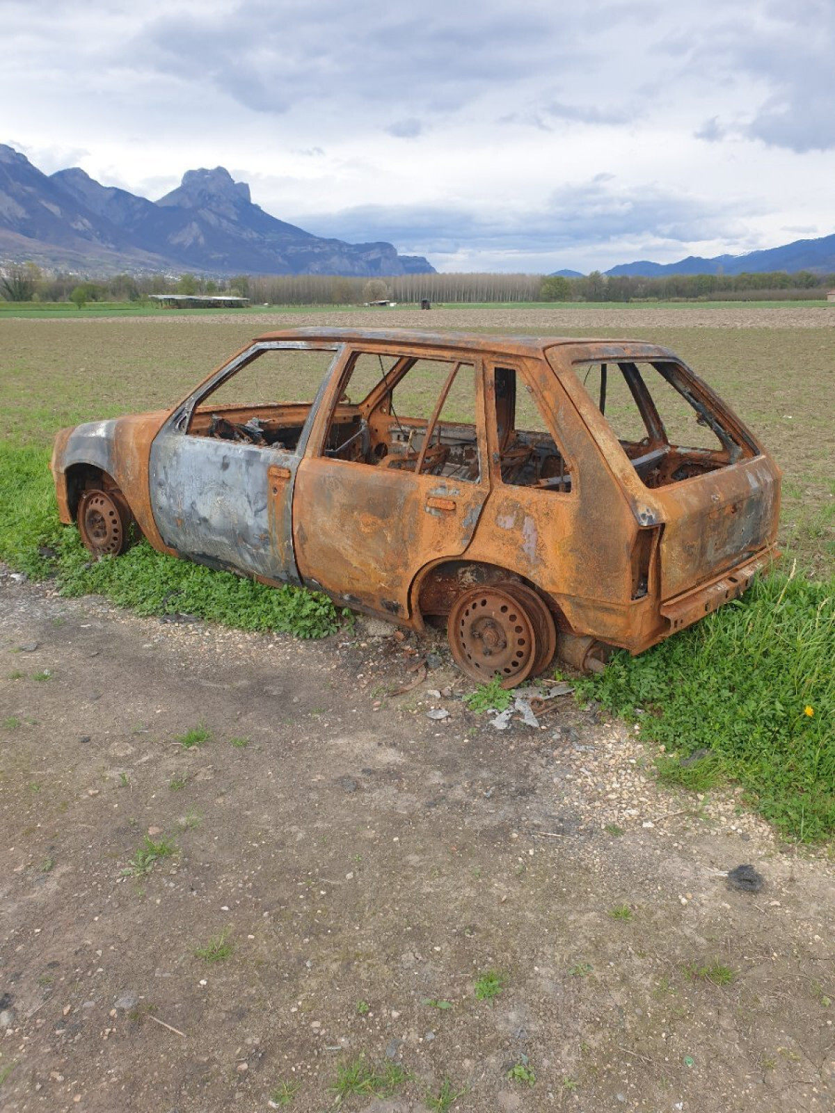 Carcasse d'un véhicule brûlé au milieu d'une plaine agricole.