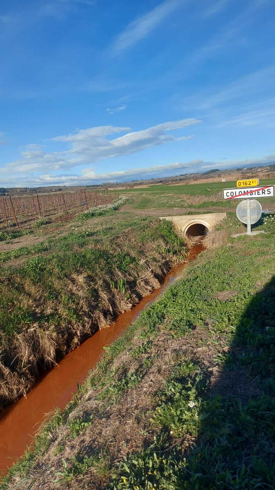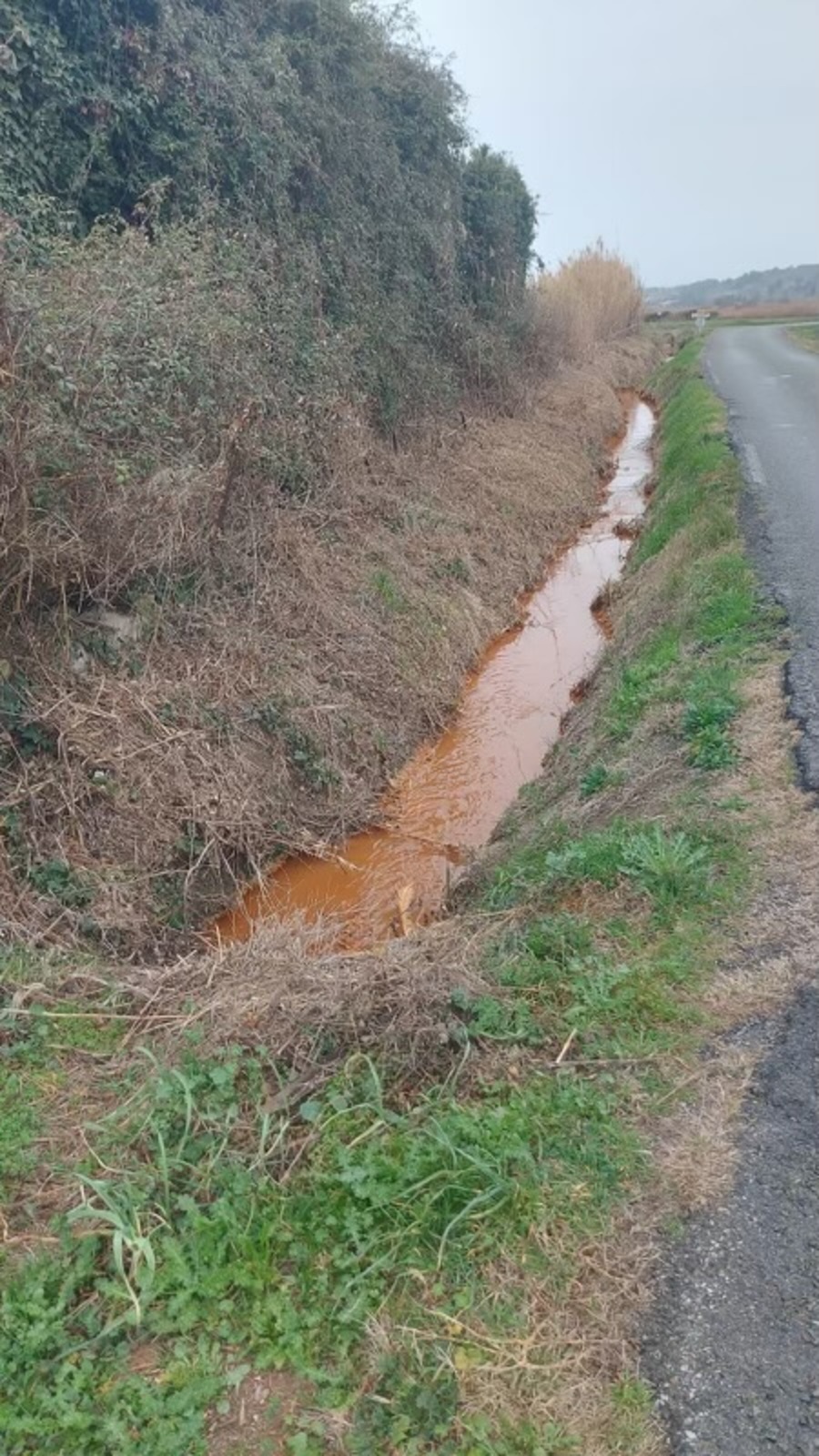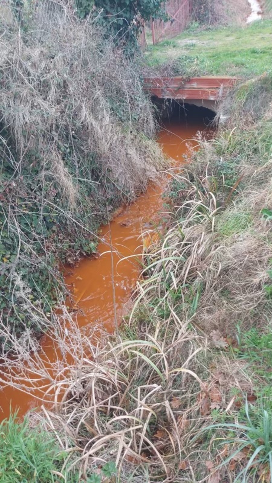 L'entreprise de nettoyage des wagons a rejeté les eaux de rinçage directement dans les fossés attenants (février 2024). Les eaux rejetées sont de couleur oranges.